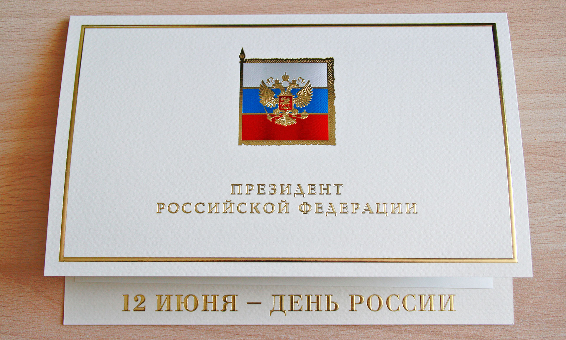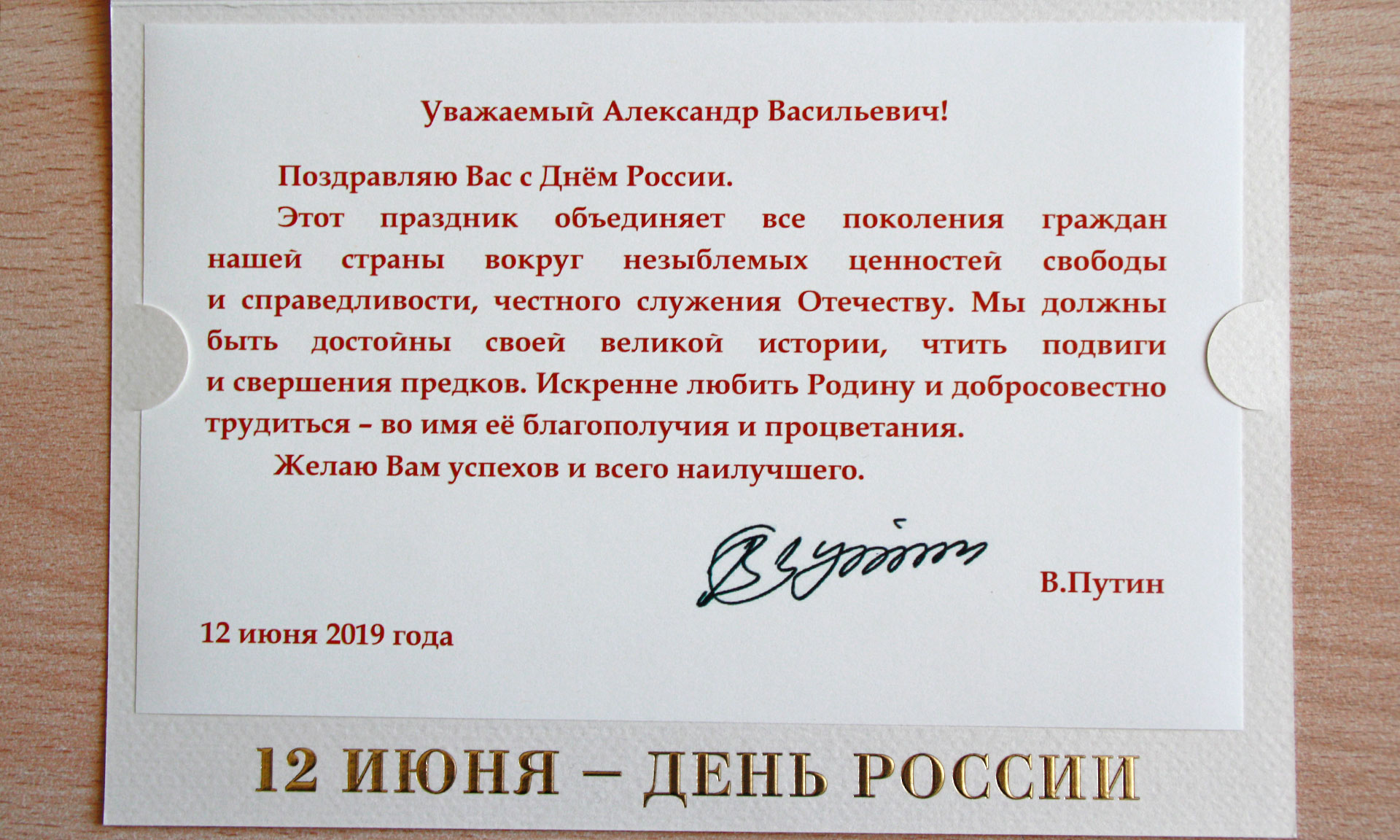 Поздравляю Вас с Днём России. Этот праздник объединяет все поколения граждан нашей страны вокруг незыблемых ценностей свободы и справедливости, честного служения Отечеству. Мы должны быть достойны своей великой истории, чтить подвиги и свершения предков. Искренне любить Родину и добросовестно трудиться — во имя её благополучия и процветания. Желаю Вам успехов и всего наилучшего».