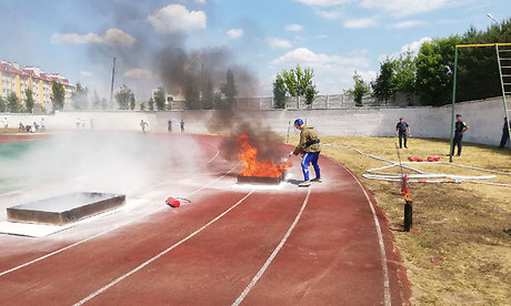 После небольшого концерта на стадионе стартовал один из самых зрелищных этапов соревнований по пожарно-спасательному спорту. Участникам на беговом круге стадиона необходимо было пройти дистанцию, преодолев высокий забор, пробежать по бревну, развернуть пожарный рукав, а также принять участие в пожарной эстафете. Параллельно с первым видом испытания команды состязались в плавании в бассейне детско-юношеской спортивной школы имени В. И. Шкурного. Все команды успешно справились с заданиями первого дня.