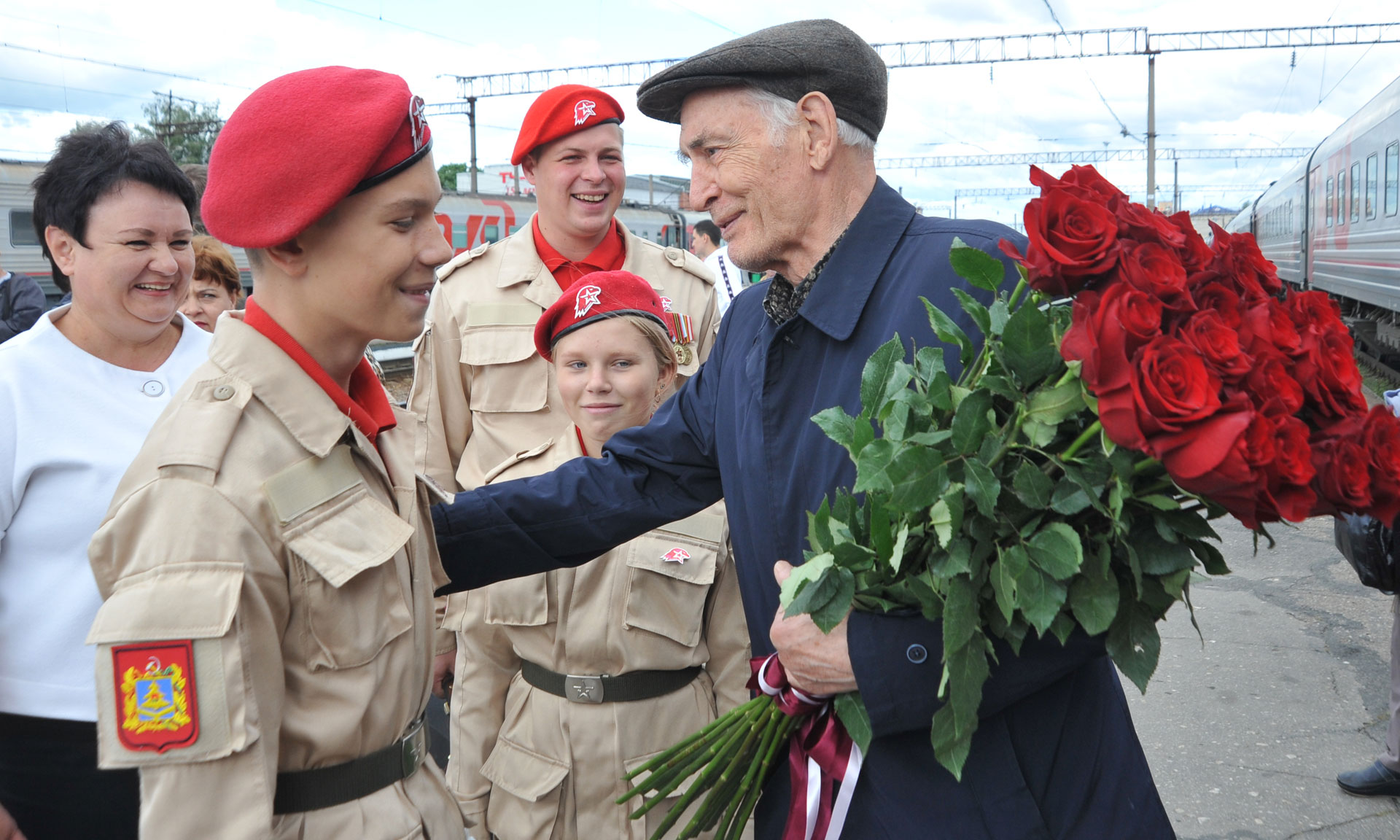 Василия Семеновича Ланового на железнодорожном вокзале встретили директор департамента культуры Брянской области Елена Кривцова и брянские юнармейцы. Почетному гостю вручили букет цветов.