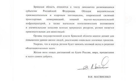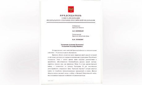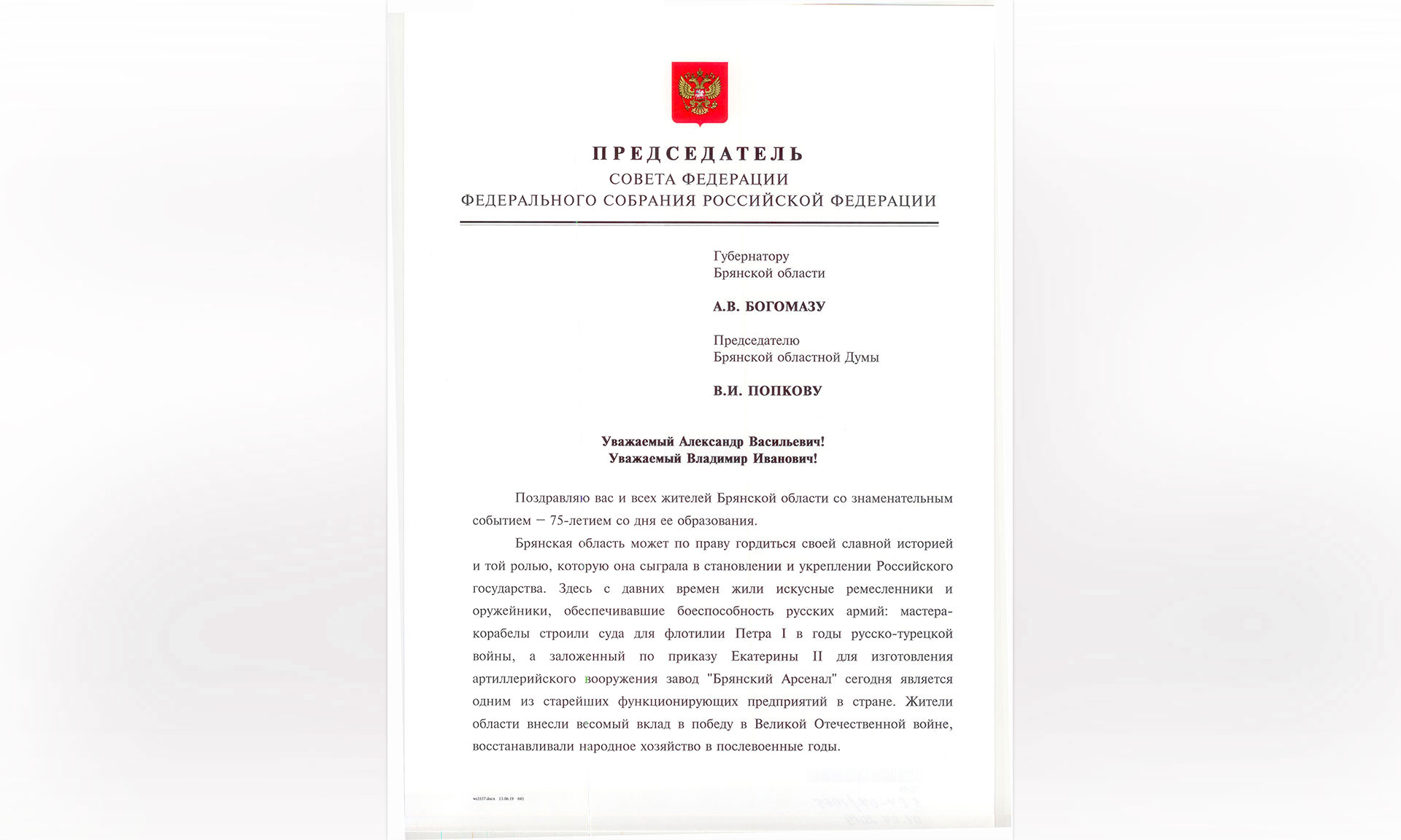На имя Губернатора Брянской области Александра Богомаза и председателя Брянской областной Думы Владимира Попкова поступило поздравление от председателя Совета Федерации Федерального Собрания РФ Валентины Матвиенко с Днём образования Брянской области.