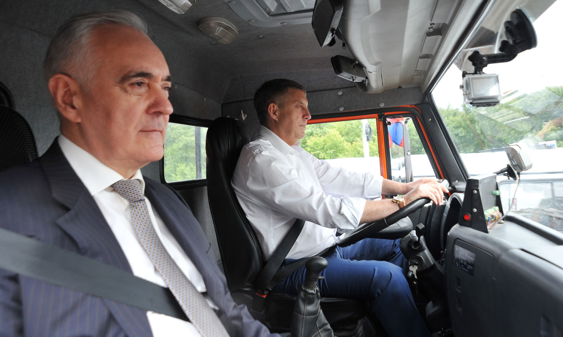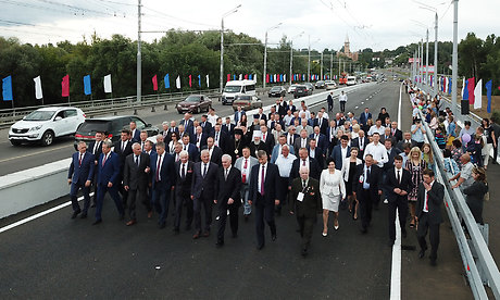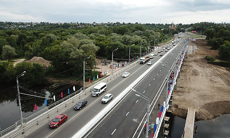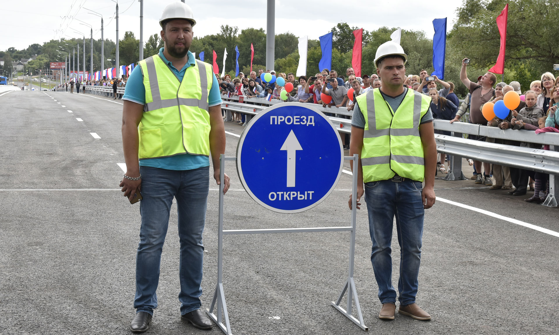 У мостостроителей есть хорошая традиция — первой по мосту проезжает дорожная техника, которая принимала участие в строительстве моста. Губернатор лично, за рулём первого автомобиля, провез по новому мосту заместителя полномочного представителя Президента РФ в ЦФО Мурата Зязикова.