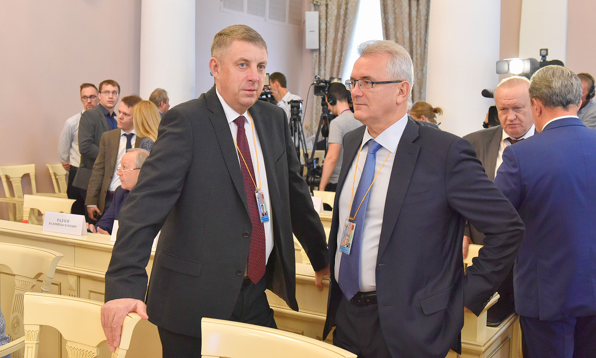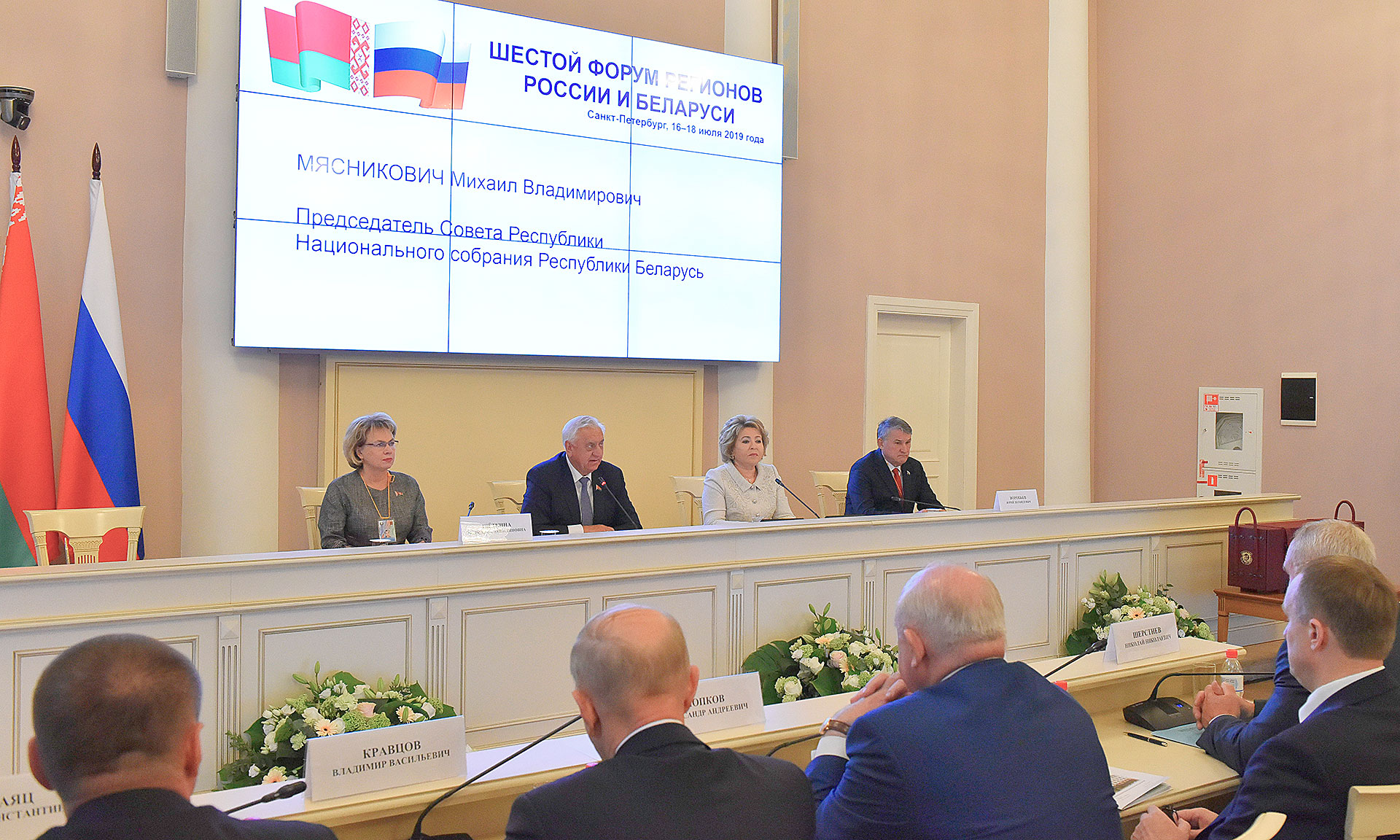18 июля в рамках VI Форума регионов России и Беларуси состоялась встреча председателя Совета Федерации Валентины Матвиенко и Председателя Совета Республики Национального собрания Республики Беларусь Михаила Мясниковича с руководителями регионов России и Беларуси.