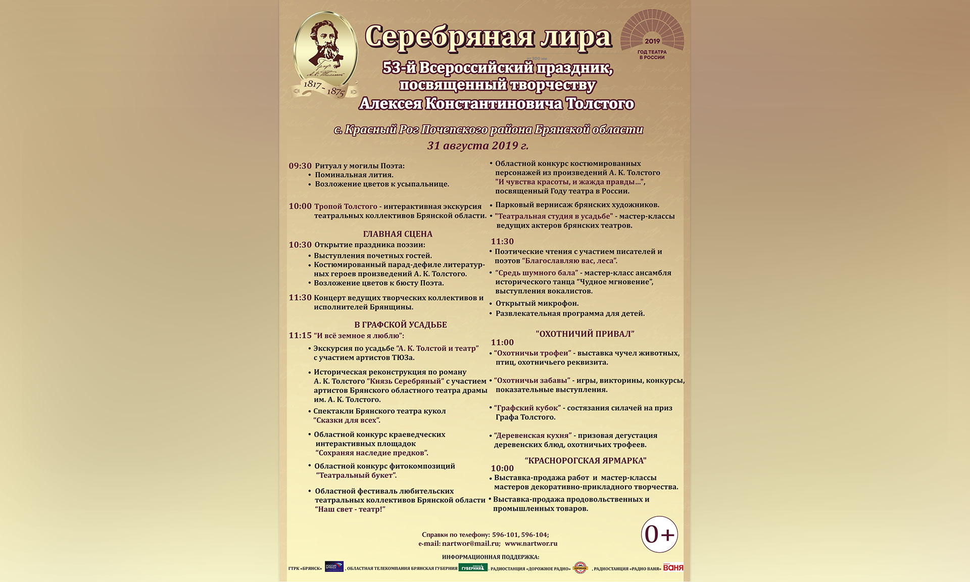 В Год театра в России именно театральное искусство станет одним из главных в программе праздника. Так, гости вместе с артистами ТЮЗа совершат с интерактивную экскурсию «А. К. Толстой и театр», увидят спектакли Брянского театра кукол «Сказки для всех», историческую реконструкцию по роману А. К. Толстого «Князь Серебряный» с участием артистов Брянского областного театра драмы им. А. К. Толстого. Областной фестиваль «Наш свет — театр!» представит выступления театральных коллективов области. Самые преданные любители театрального искусства смогут стать участниками мастер-классов ведущих актеров брянских театров.