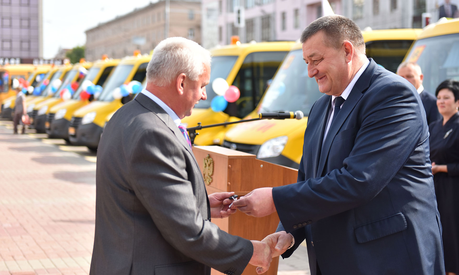 На торжественной церемонии вручения школьных автобусов присутствовали Губернатор Брянской области Александр Богомаз; председатель Брянской областной Думы Владимир Попков; главный федеральный инспектор по Брянской области Андрей Дьячук; депутаты Государственной Думы Федерального Собрания Российской Федерации Валентина Миронова и Валентин Суббот, вице-губернатор Брянской области Александр Резунов, заместитель Губернатора Брянской области Владимир Оборотов, директор департамента образования и науки Татьяна Кулешова, руководители города Брянска, председатели комитетов и депутаты Брянской областной Думы, руководители исполнительных органов государственной власти, руководители муниципальных образований Брянской области, руководители образовательных организаций.