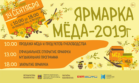 14 сентября 2019 года с 10.00 до 18.00 на площади ТРЦ «БУМ сити» Брянска состоится традиционная областная «Ярмарка мёда-2019».