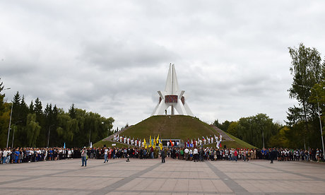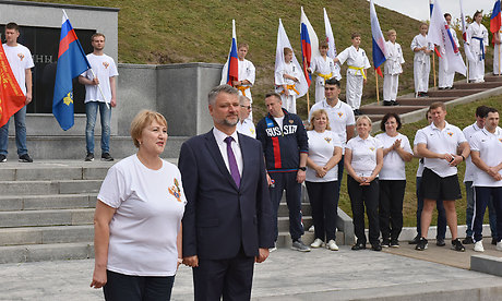 Участники марафона и официальные лица почтили минутой молчания память воинов, павших на фронтах Великой Отечественной войны 1941–1945 годов, возложили цветы и венки и к стеле «Брянск — город воинской славы».