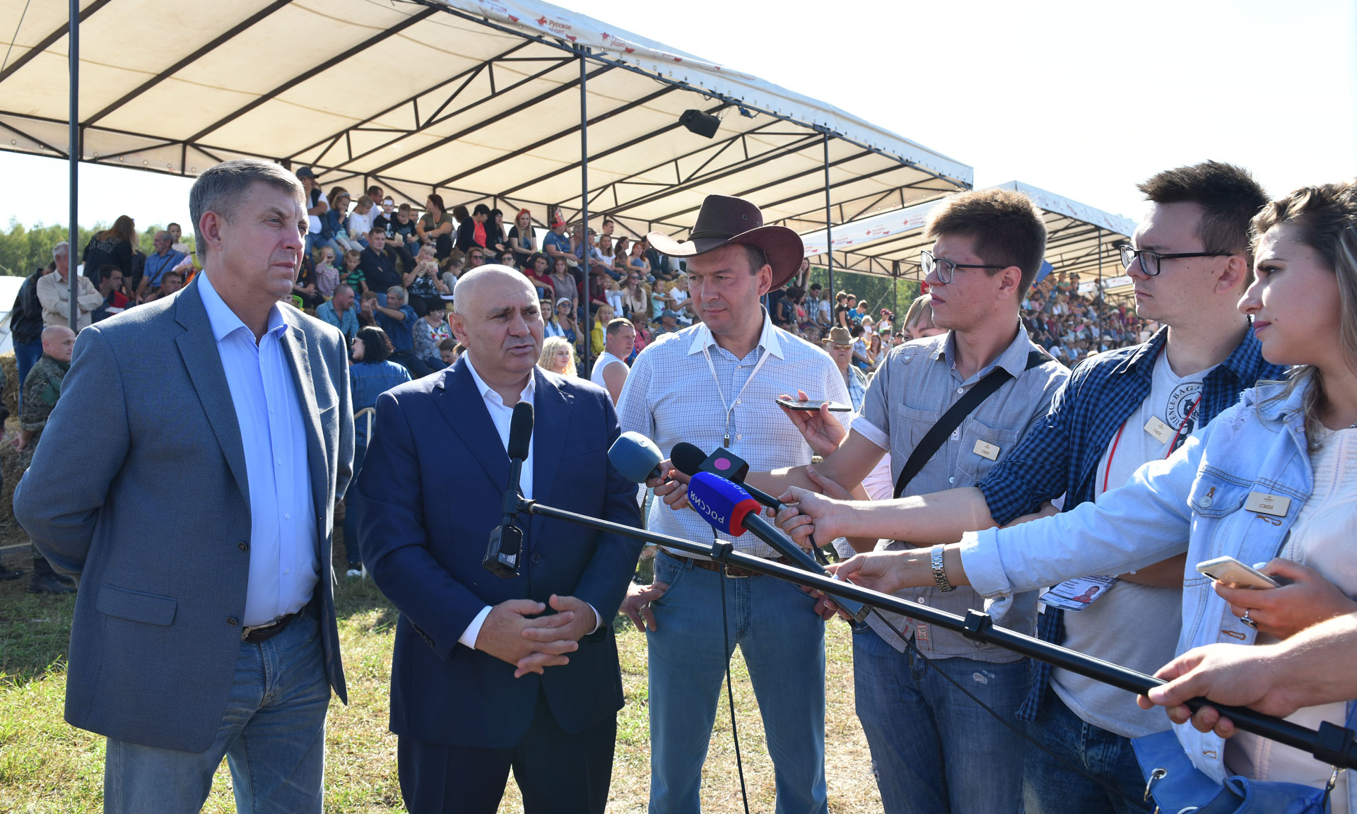 Первый заместитель Министра сельского хозяйства РФ Джамбулат Хатуов, Губернатор Брянской области Александр Богомаз и президент АПХ «Мираторг» Виктор Линник ответили на вопросы журналистов перед началом праздника «Русское родео-2019», который состоялся на ферме «Леденево» в Жуковском районе.