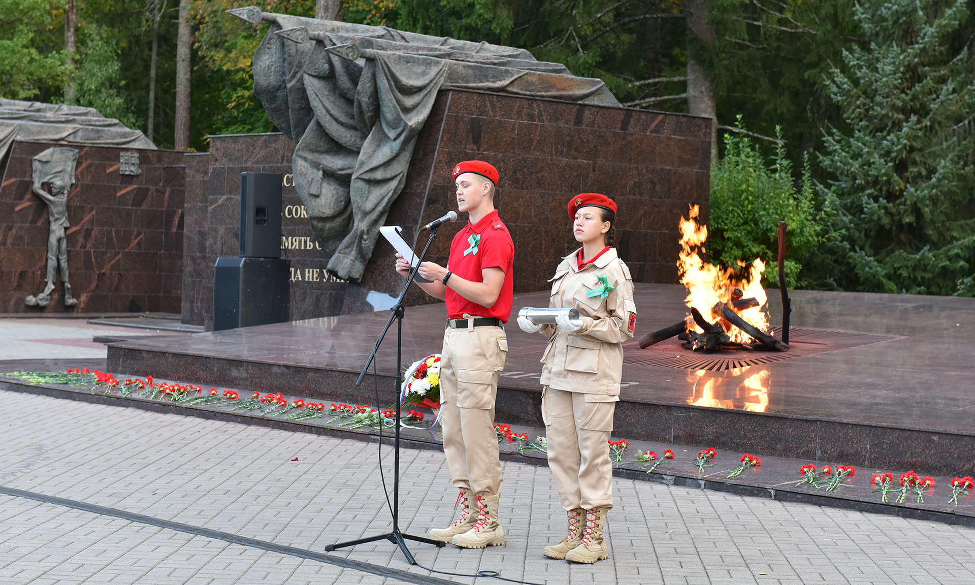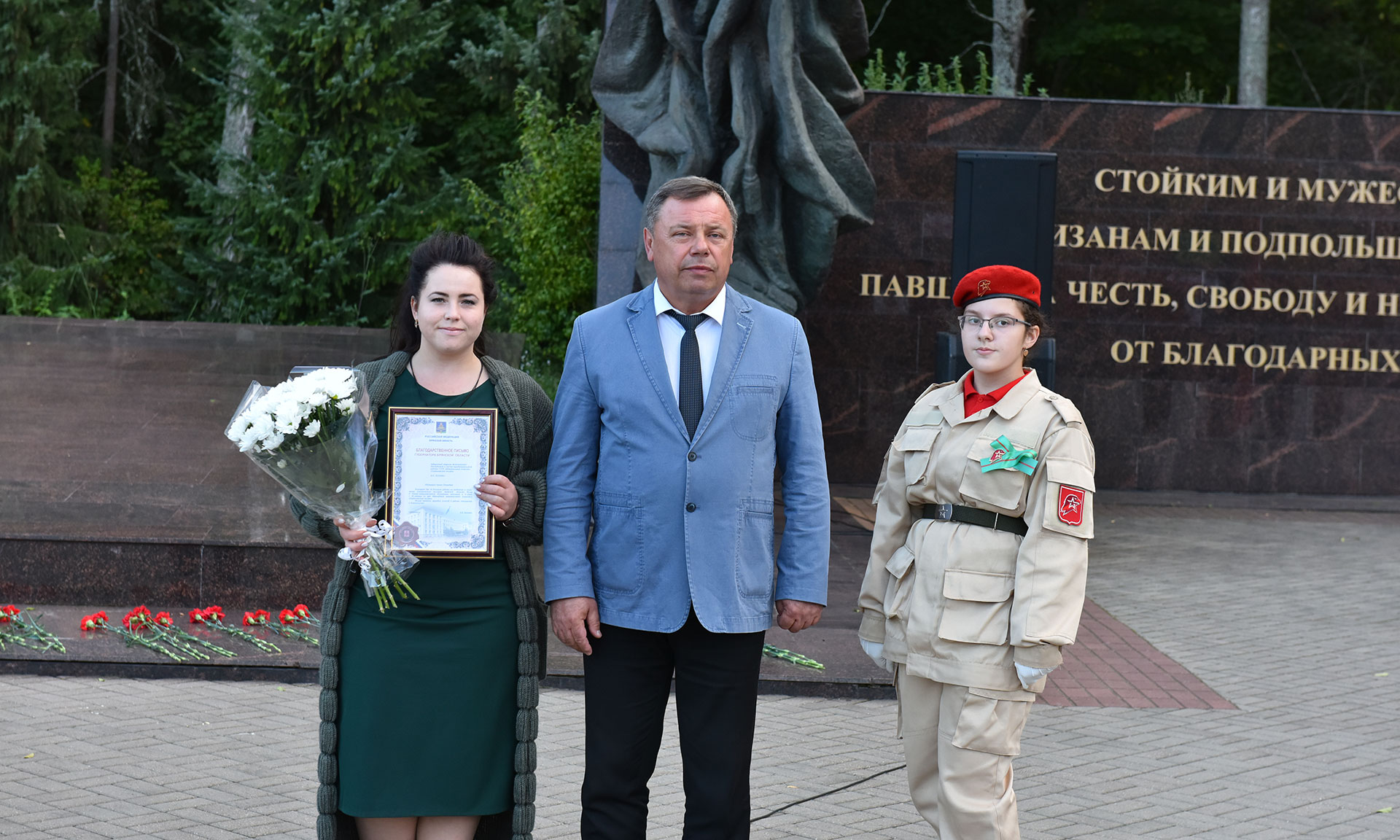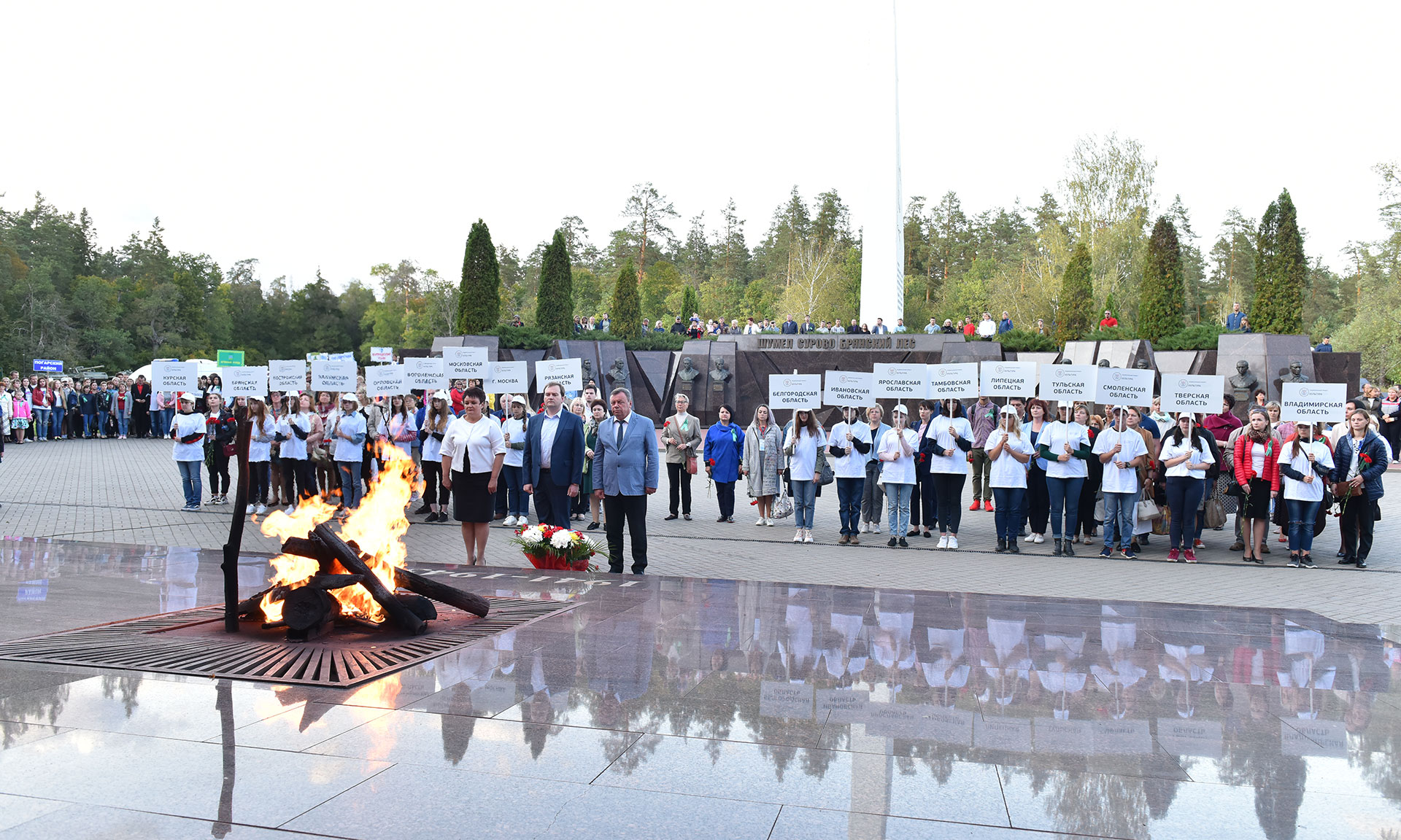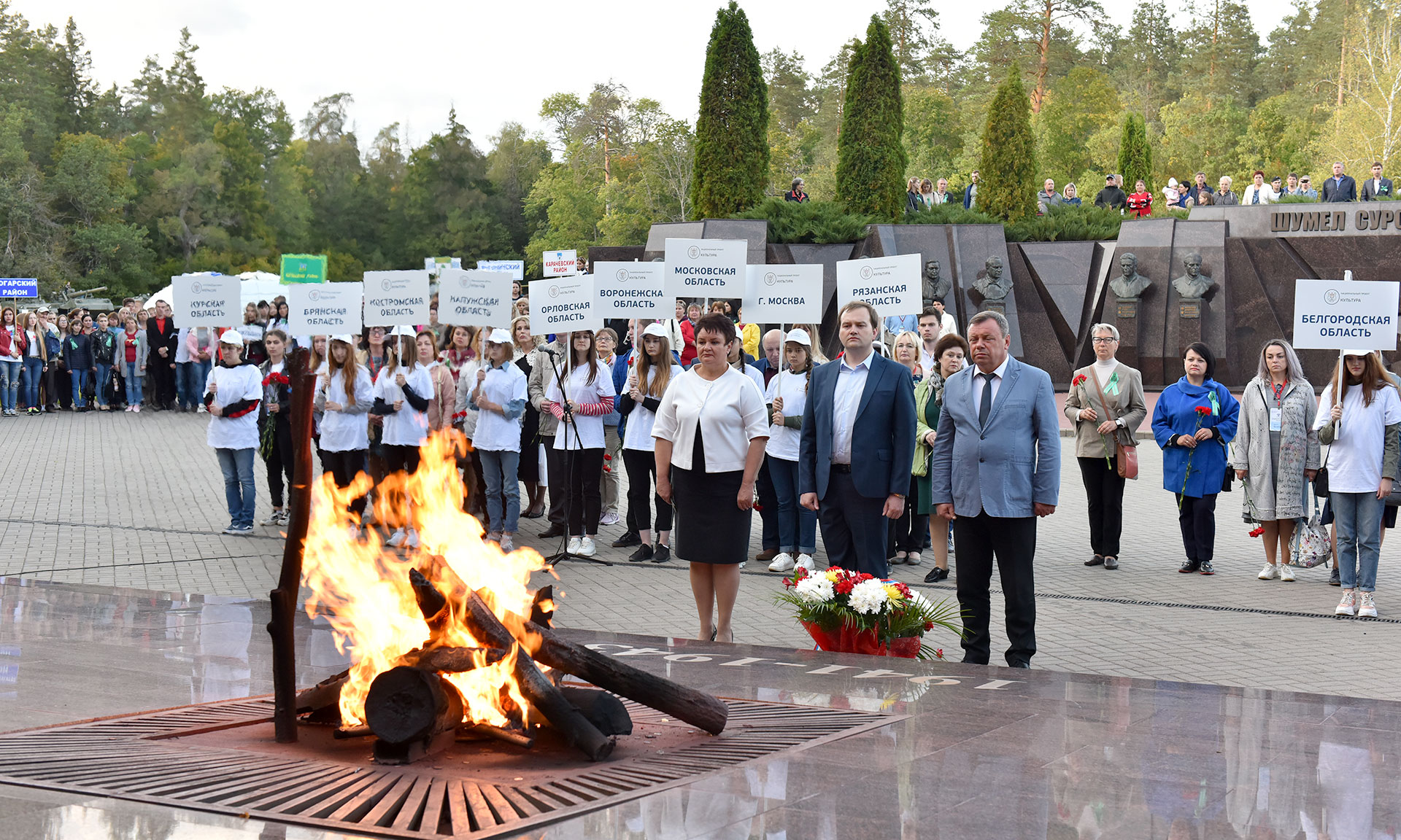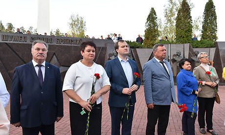 В знак памяти и благодарности героям, отдавшим свои жизни за счастливую жизнь молодых поколений цветы возложили заместитель Губернатора Брянской области Владимир Оборотов, начальник отдела образовательной, творческой и проектной деятельности департамента науки и образования Министерства культуры РФ Дмитрий Шмидт, член координационного совета при министерстве Российской Федерации, начальник управления культуры и архивного дела Тамбовской области Юрий Голубев, директор департамента культуры Брянской области Елена Кривцова, руководители и представители органов управления культуры регионов Центрального Федерального округа.