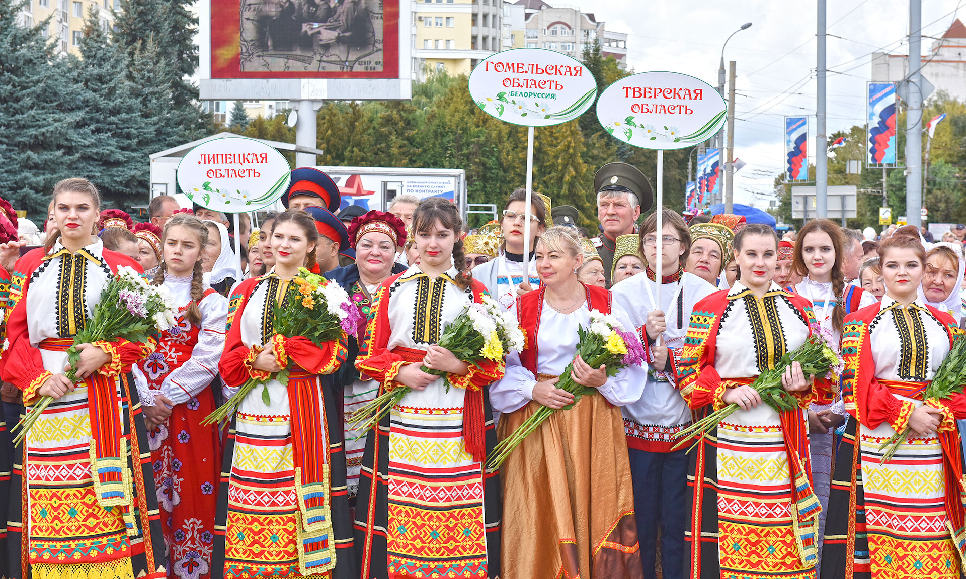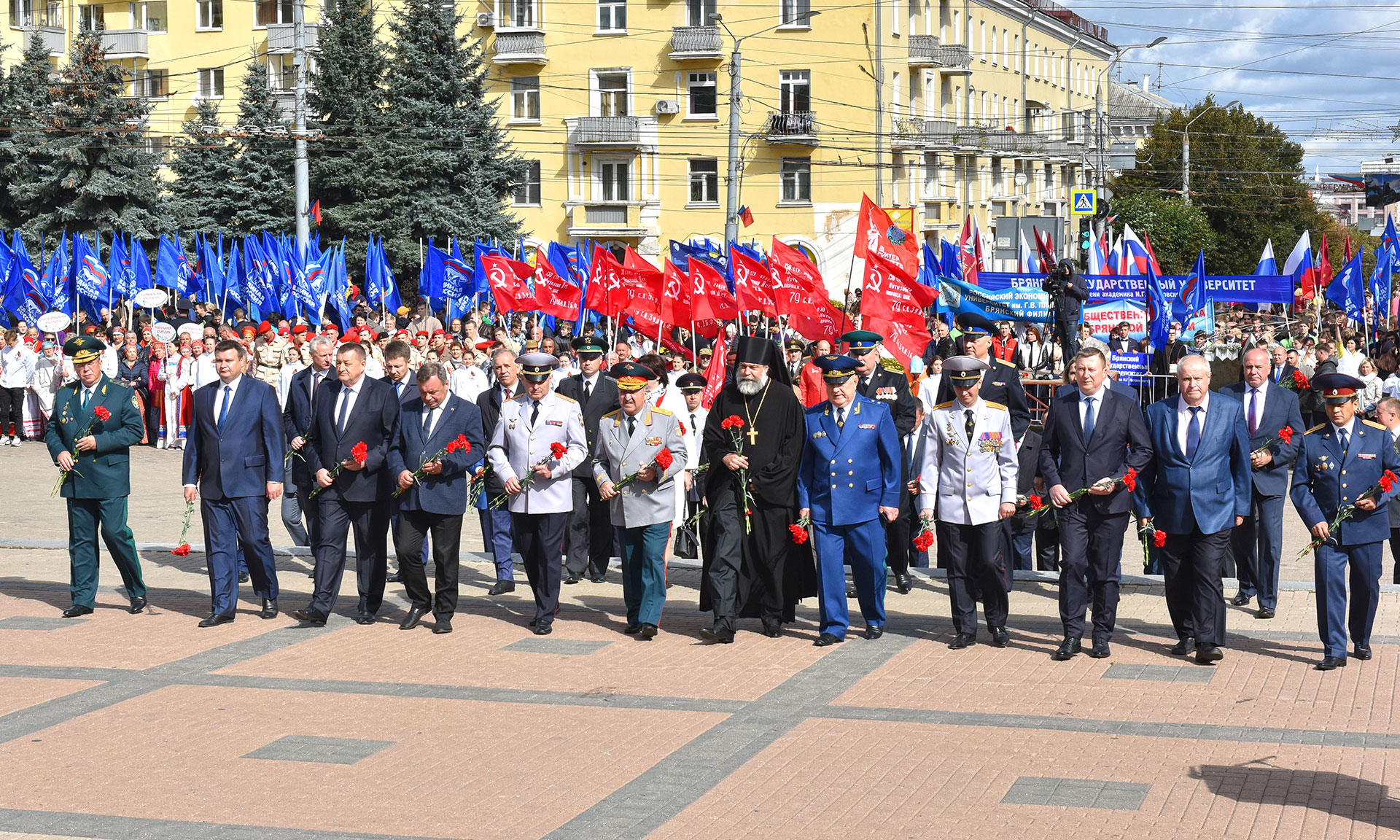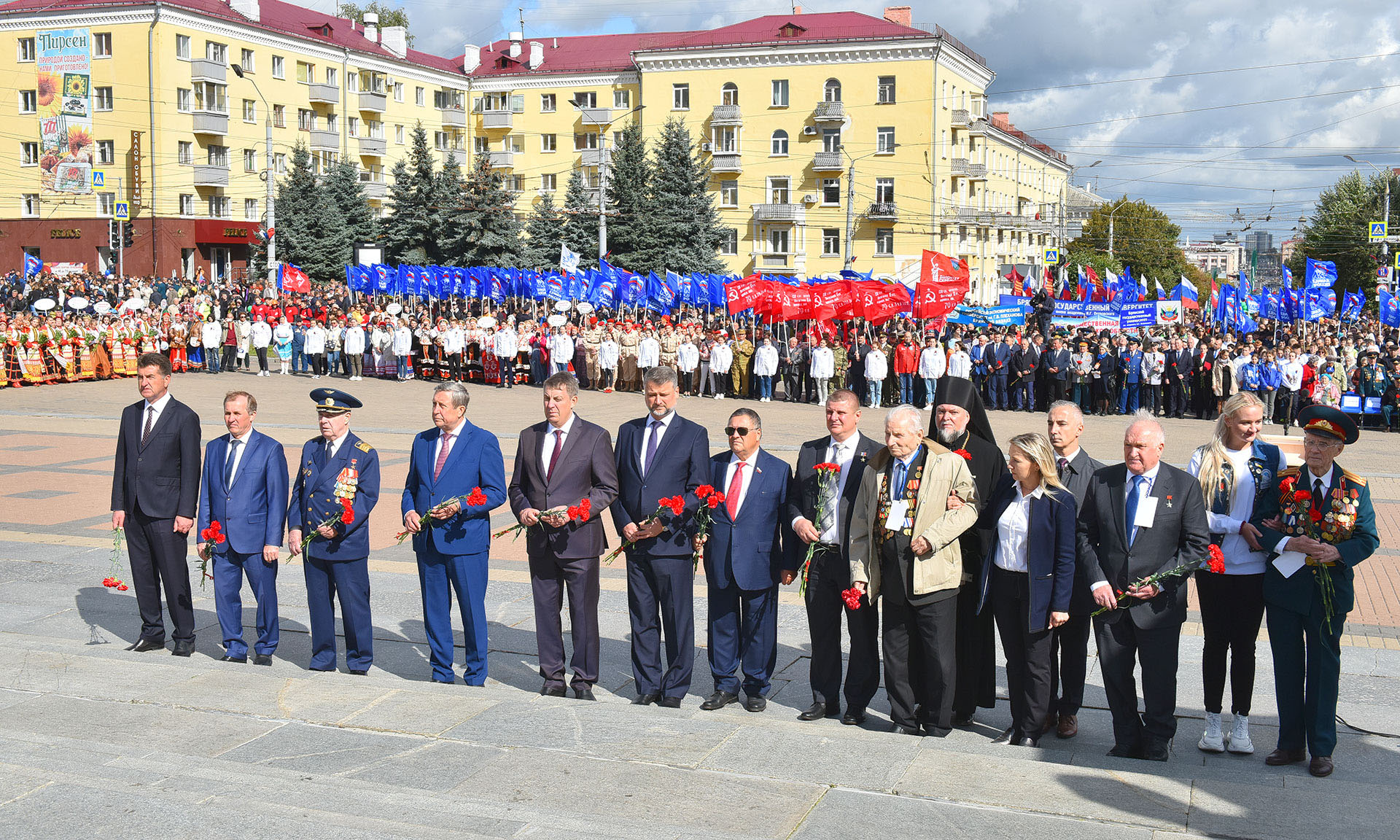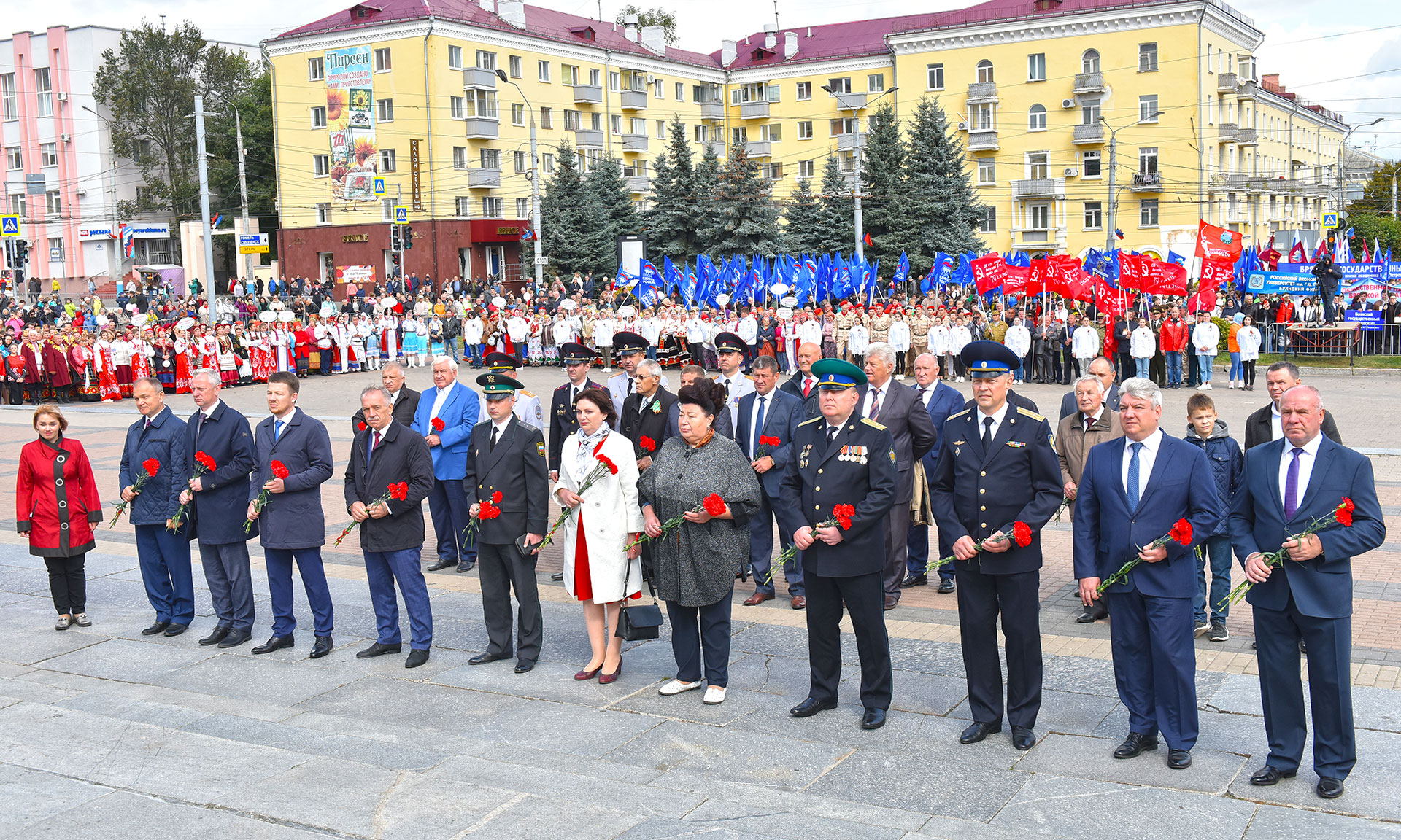 В день освобождения Брянской области от немецко-фашистских захватчиков и Дня города Брянска поклониться подвигу воинов, освобождавших нашу родную землю, партизан и подпольщиков, воевавших в тылу врага, пришли ветераны Великой Отечественной войны, почетные граждане Брянской области и города Брянска, Герои Советского Союза и Социалистического труда, Герои России — уроженцы Брянской земли, делегации городов Москвы, Орла, Владимира, Грозного, Урус-Мартана, Иваново, Курска, Рязани, Тулы, Гаджиево, Козельска, Гомеля, Могилева, Бреста Республики Беларусь, Гагаузии, Молдовы, Польши, Латвии, Сербии, Италии, делегации трудовых коллективов, студентов, школьников, представителей общественных организаций и объединений, руководители органов государственной власти Брянской области, участники XV Всероссийского фестиваля народных хоров «Поет село родное».