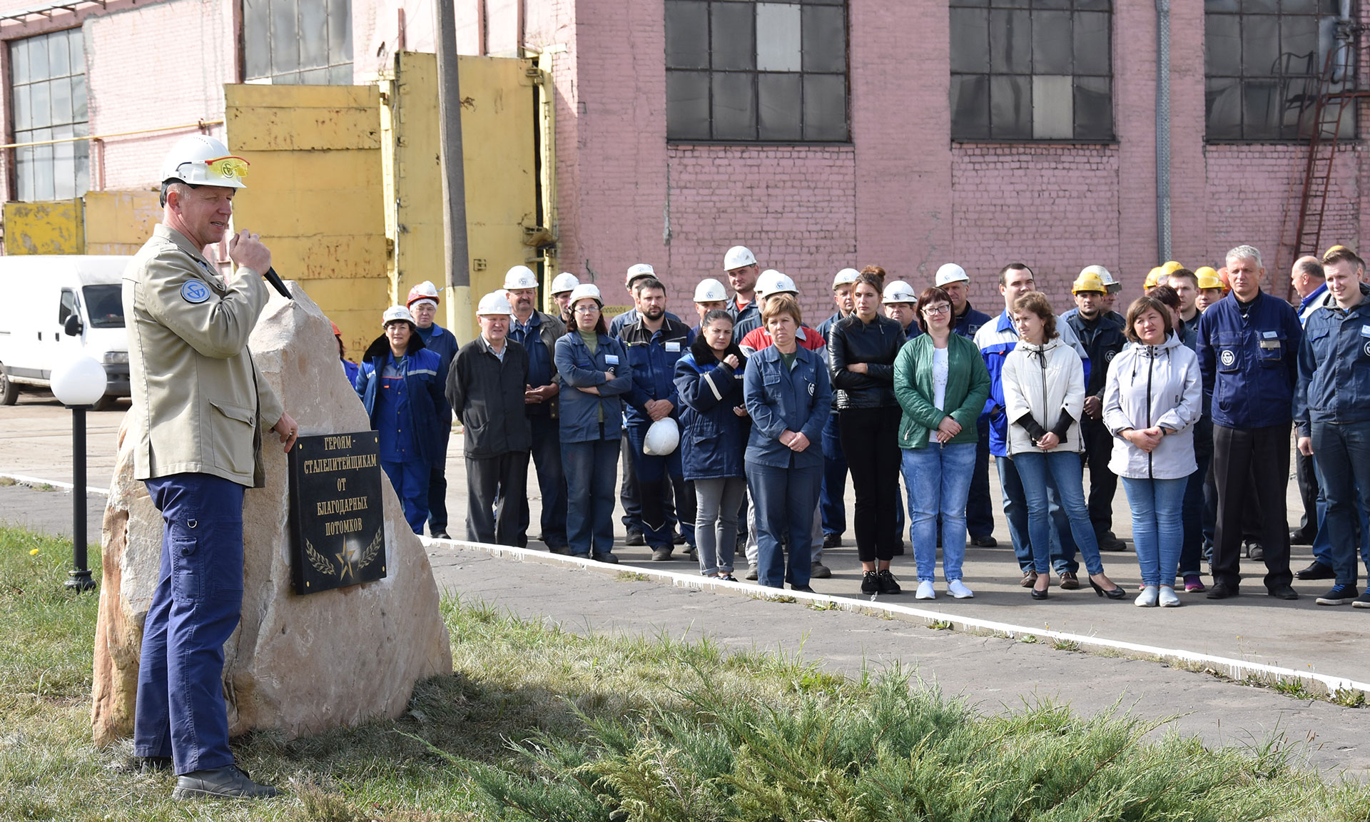 Гранитный камень разместился напротив здания заводоуправления. На нем размещена памятная надпись «Героям-сталелитейщикам от благодарных потомков». На церемонию открытия собрались представители трудового коллектива АО «ПО «Бежицкая сталь».