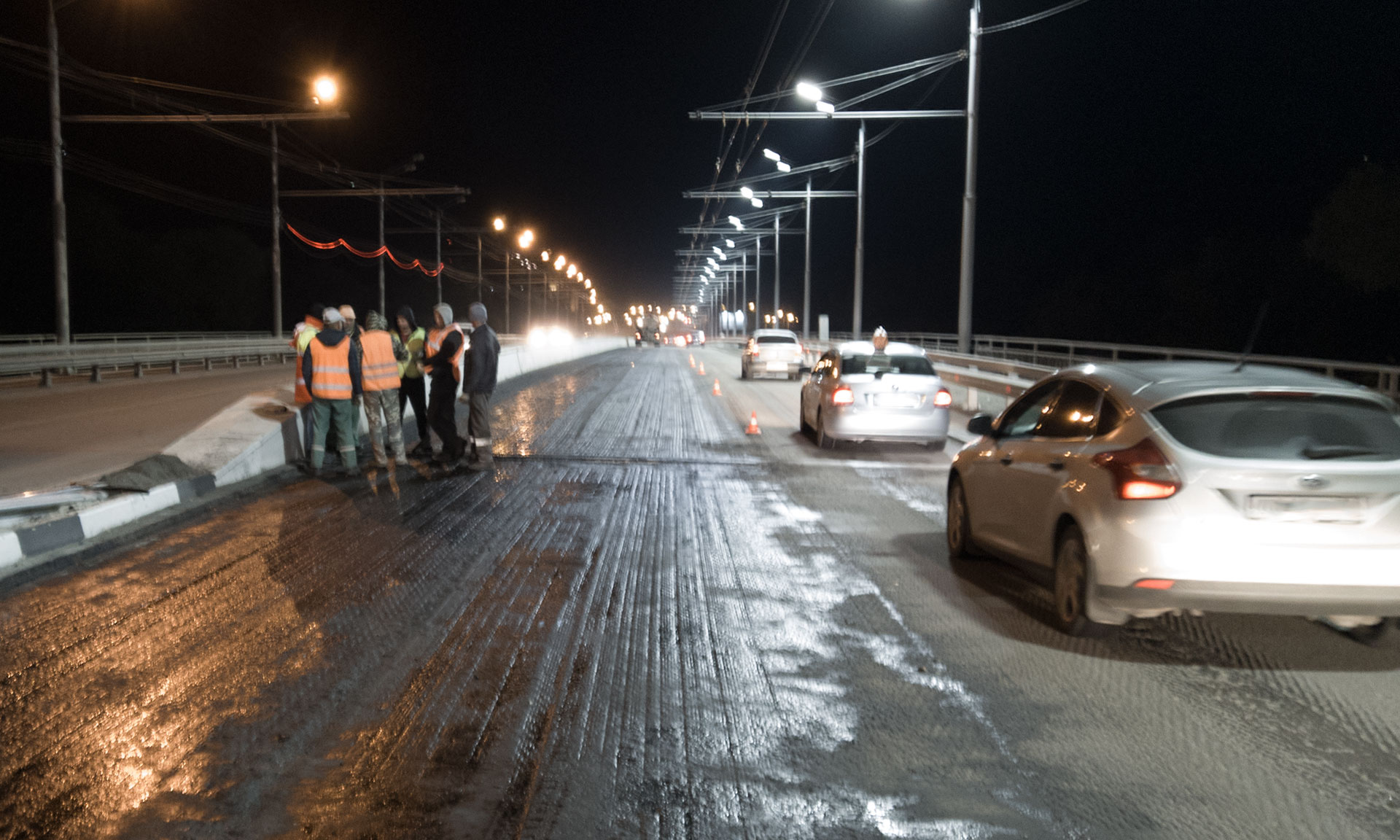 На Первомайском мосту начались работы по устранению недочетов, которые выявила комиссия на объекте. Подрядчик уже приступил к укладке нового слоя асфальта.