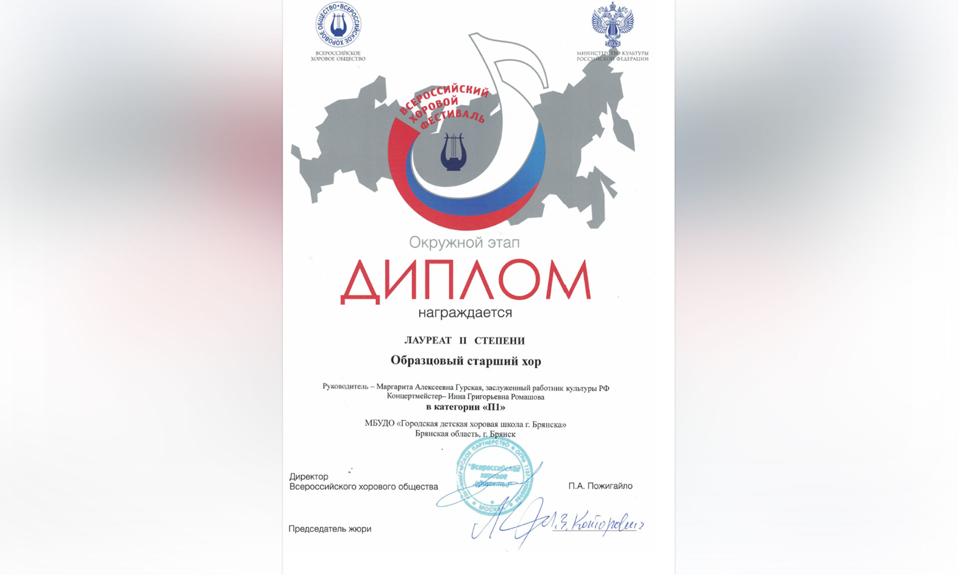 Образцовый старший хор Городской детской хоровой школы города Брянска (руководитель Маргарита Гурская, Заслуженный работник культуры РФ, концертмейстер Инна Ромашова) стал лауреатом II степени на Окружном этапе Всероссийского хорового фестиваля. Образцовый старший хор Городской детской хоровой школы города Брянска является одним из лучших хоровых коллективов в Центральном федеральном округе, и по праву достойно представляет Брянскую область на различных конкурсах областного и всероссийского уровня.