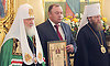 Ваше Святейшество, Вы сегодня совершили великий чин освящения собора и божественную литургию. Мы с нетерпением ждали Вашего приезда, понимая, как Вы загружены. Поэтому мы приносим свои сыновние благодарности и в то же время просим прощения за то, что потревожили Вас. Но Вы, посетив Брянщину, принесли всем огромную радость! Вы видите, как много людей, детей, молодежи… И мы благодарим Вас за это и просим не оставлять нас в своих святых молитвах и принять на молитвенную память вот этот животворящий крест, образ Божьей Матери Свенской. Пусть этот набор напоминает о Вашем посещении Брянщины и освящении Успенского кафедрального собора — главной святыни Брянской древней намоленной земли.