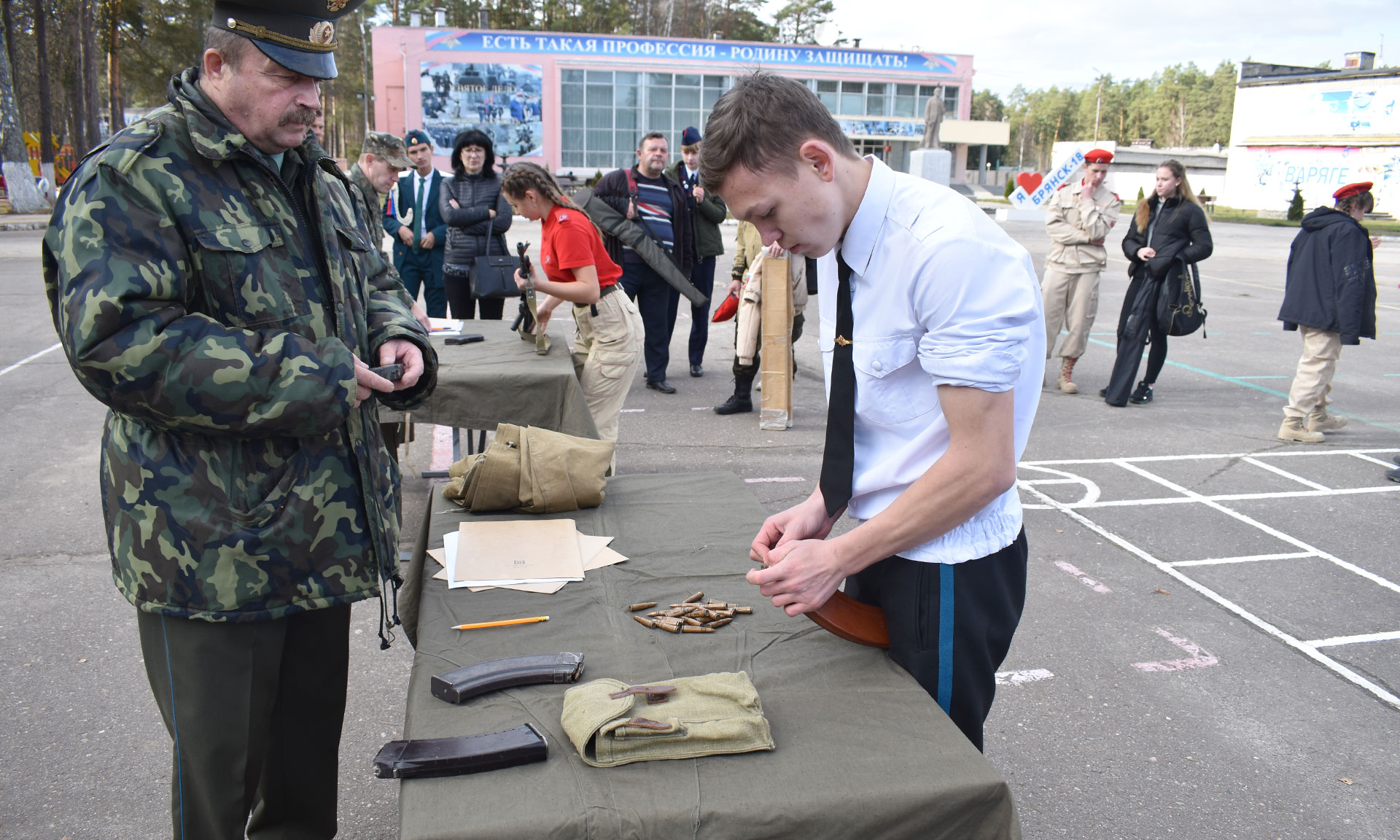 Даниил Веркеев (СОШ № 4 им. В. И. Ленина, Клинцы) быстрее всех разбирал и собирал автомат Калашникова и снаряжал магазин к нему в конкурсе «Знай свое оружие».