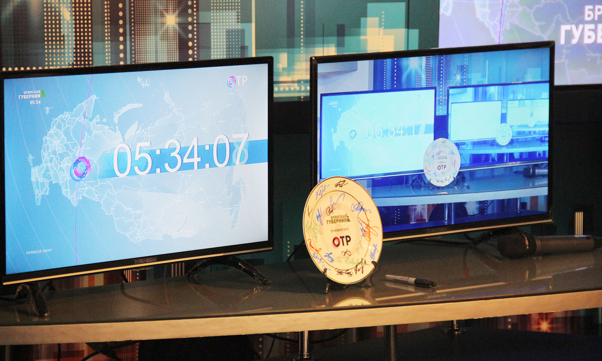 По телевизионной традиции в первый день съемок об штатив камеры разбивается тарелка. Не стало исключением и врезка «Брянской Губернии» в Общественное телевидение — директор телекомпании Артем Сухоломкин в честь нового проекта разбил тарелку, а символические осколки об этом событии вручил на память почетным гостям. Побывали гости и в студии «32 радио». Во время радиоэфира Александр Богомаз ответил на вопросы ведущих, рассказал о тех успехах и достижениях, и самое главное, задачах, которые сегодня стоят перед областью. Пообщались со слушателями также Андрей Дьячук и Владимир Пронин. А в конце эфира Александр Богомаз отметил, что все сегодняшние успехи в развитии области — это, несомненно, результат труда наших жителей, которые всей душой так любят нашу родную Брянщину.
