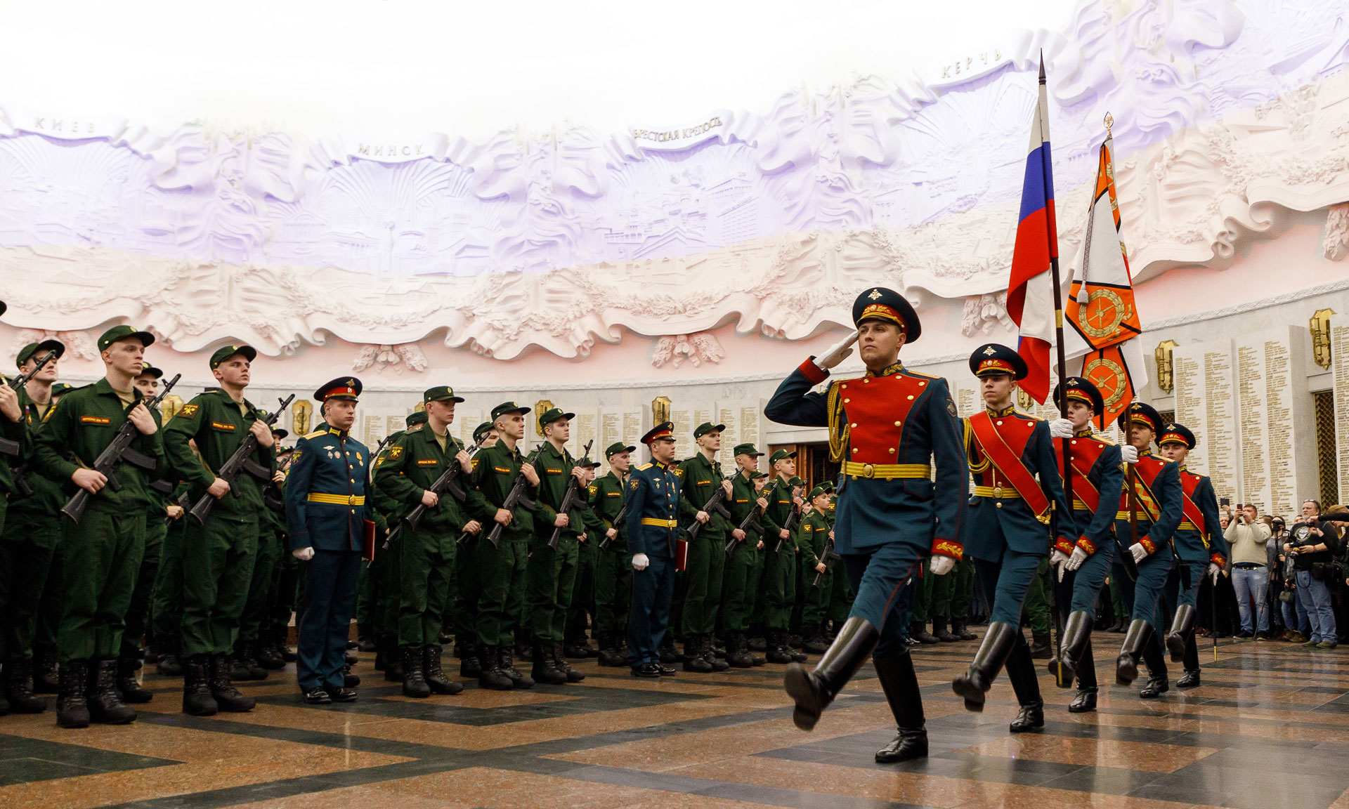 Перед началом церемонии военнослужащим показали светозвуковую инсталляцию «Дорога к Победе». Под куполом зала славы развернулись основные сражения Великой Отечественной войны. Затем в зал, на стенах которого высечены фамилии почти 12 тысяч Героев Советского Союза, получивших это звание за подвиги в годы войны, внесли Боевое знамя полка и Государственный флаг Российской Федерации.