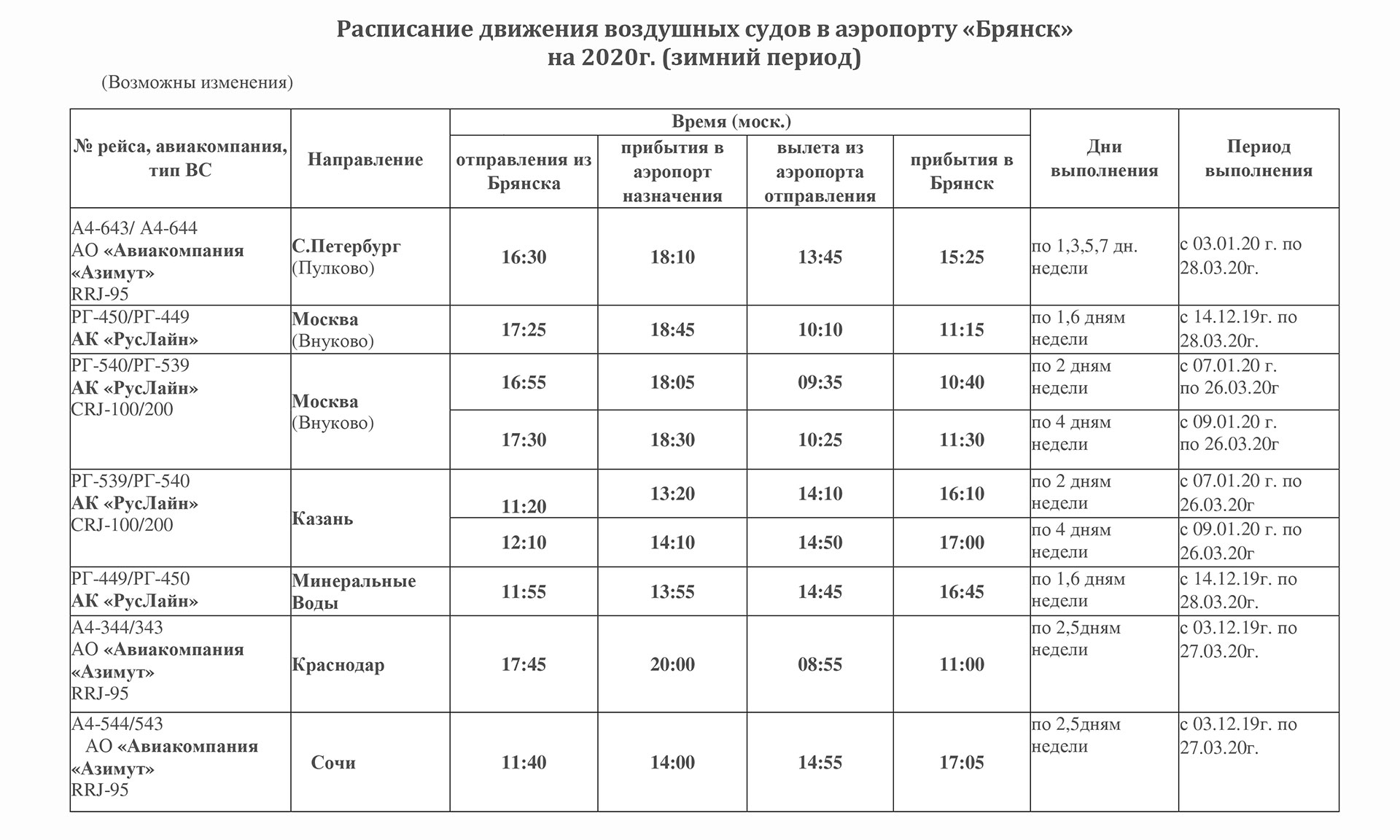 Директор АО «Международный аэропорт «Брянск» Александр Сай подтвердил, что на 2020 год планируется перевезти в районе 100 тысяч пассажиров. Прорабатываются вопросы дальнейшего открытия новых рейсов, например, по маршрутам Екатеринбург — Брянск — Минск и, возможно, Брянск — Геленджик.