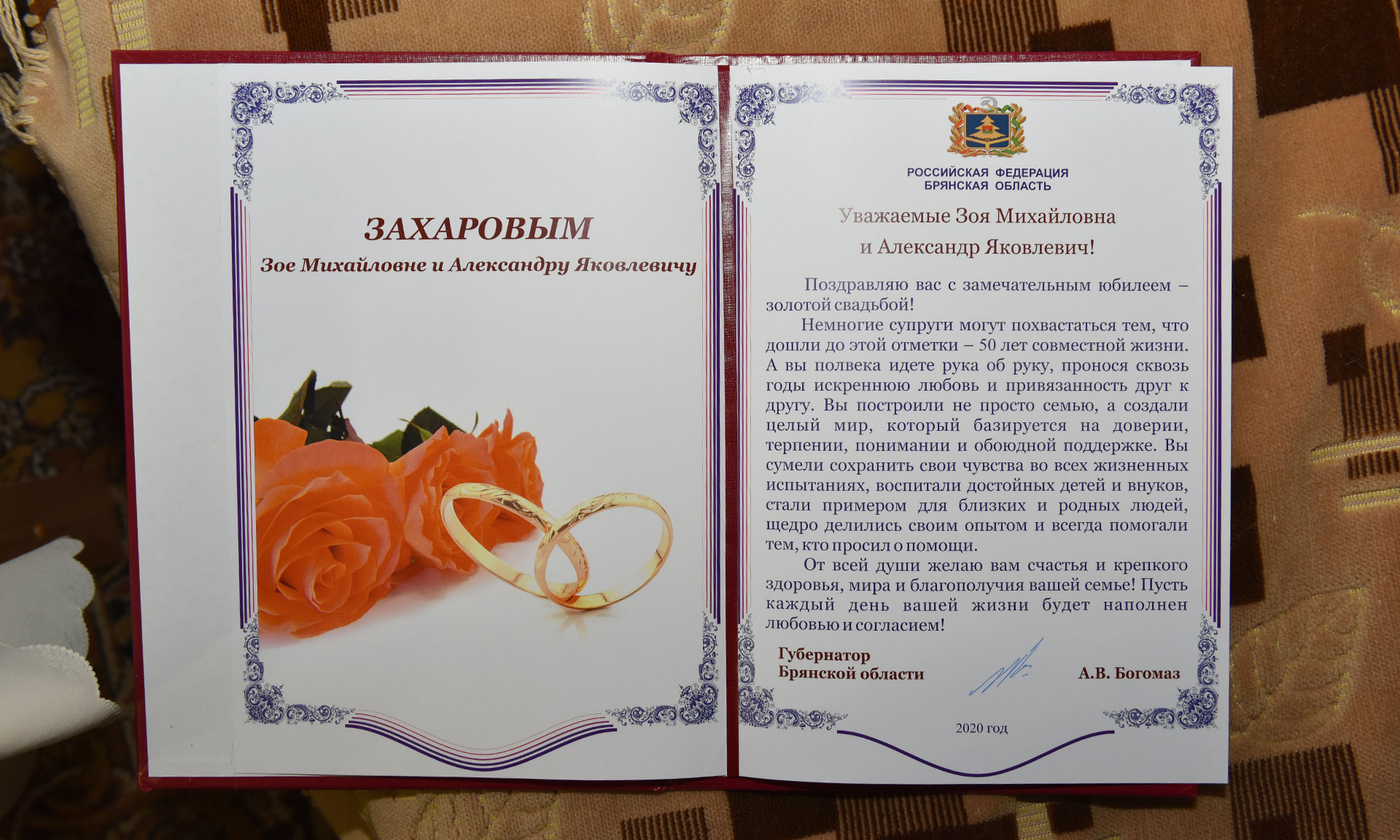 16 января Зоя Михайловна и Александр Яковлевич Захаровы из Брянска отметили золотую свадьбу. Их брак был зарегистрирован 16 января 1970 года в ЗАГСе Советского района города Брянска.