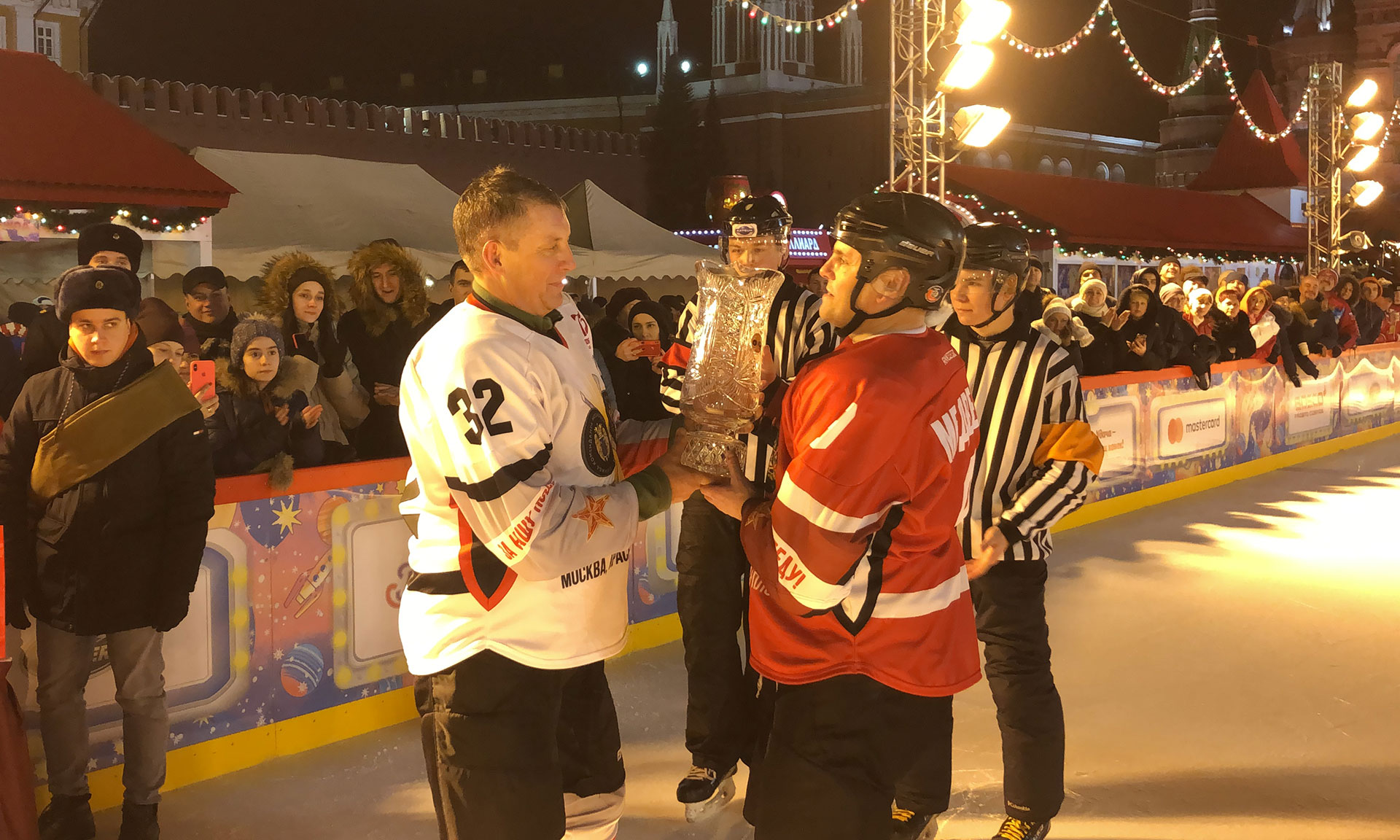После церемонии награждения всех участников товарищеского хоккейного матча на Красной площади состоялись массовые катания, флэш-моб, эстафеты, катания на каруселях ГУМ-ярмарки, работала полевая кухня, где можно было попробовать настоящую солдатскую гречневую кашу и согреться горячим чаем.