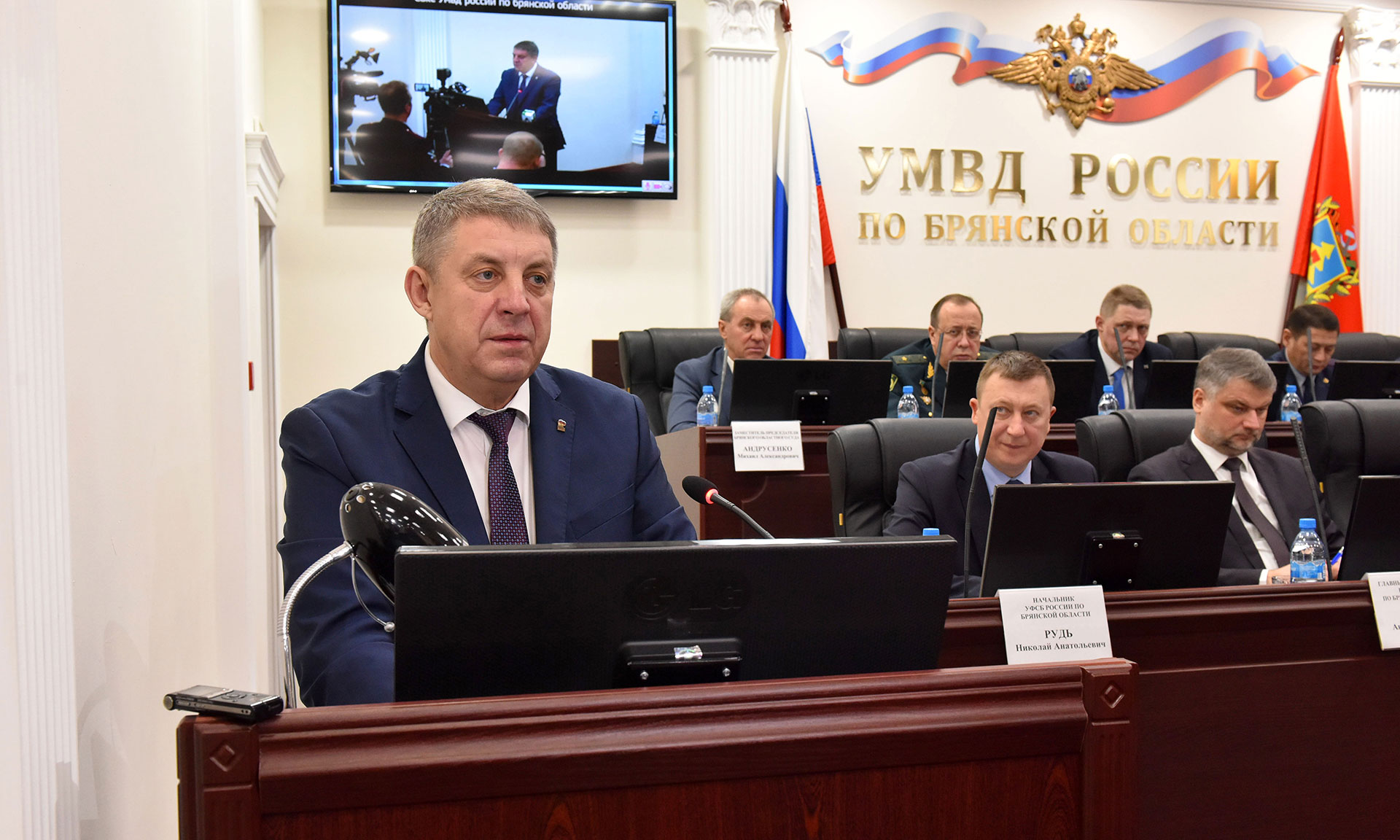 28 января Губернатор Брянской области Александр Богомаз принял участие в расширенном заседании коллегии УМВД России по Брянской области, на котором подвели итоги работы органов внутренних дел региона в 2019 году. Его провел начальник УМВД России по Брянской области Владислав Толкунов.