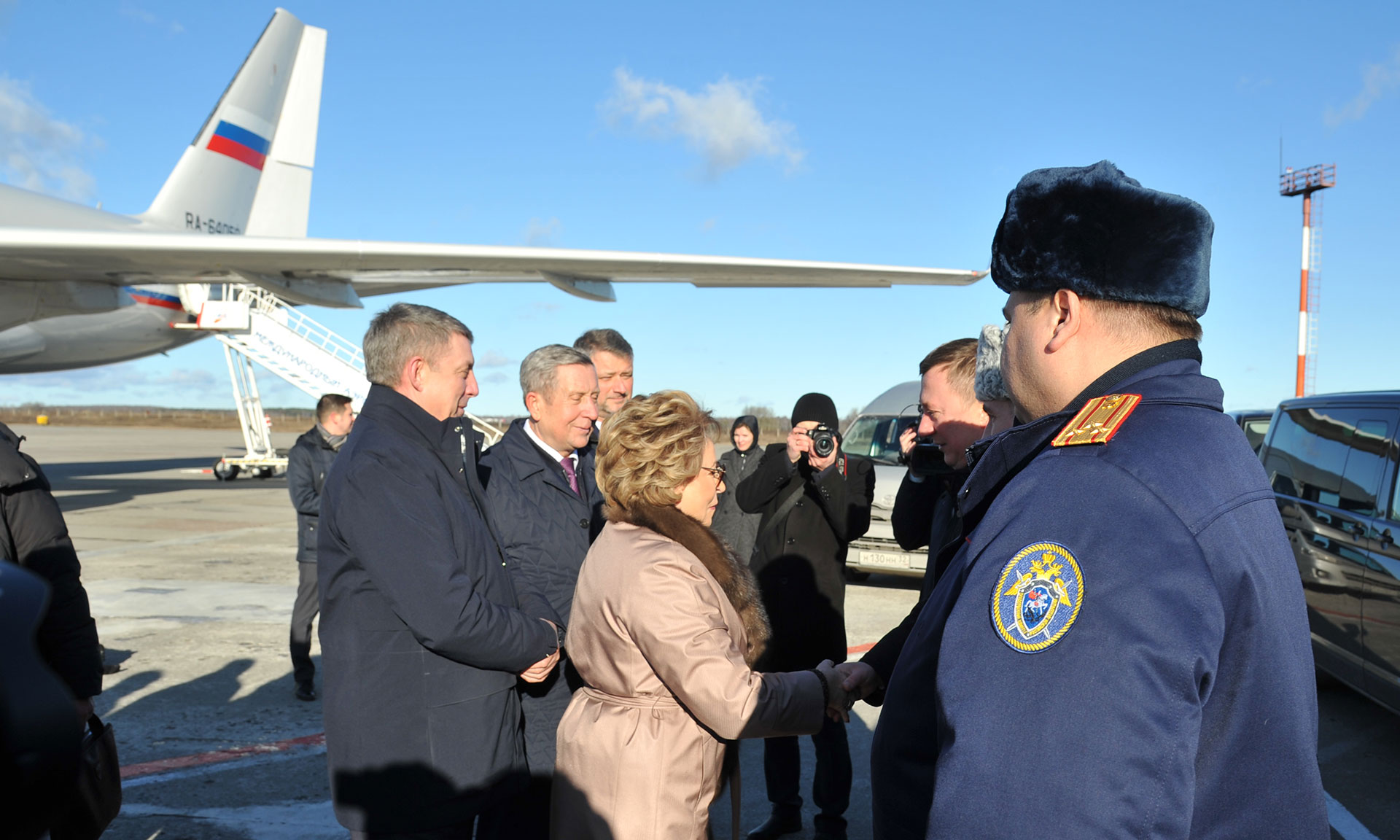 В международном аэропорту «Брянск» Валентину Матвиенко встречали Губернатор Брянской области Александр Богомаз, председатель Брянской областной Думы Владимир Попков, главный федеральный инспектор по Брянской области Андрей Дьячук, члены Совета Федерации ФС РФ Сергей Калашников, Галина Солодун, председатель Брянского областного суда Евгений Быков, прокурор Брянской области Александр Войтович, начальник УФСБ России по Брянской области Николай Рудь, начальник УМВД России по Брянской области Владислав Толкунов, руководитель следственного управления СК РФ по Брянской области Максим Лукичёв.