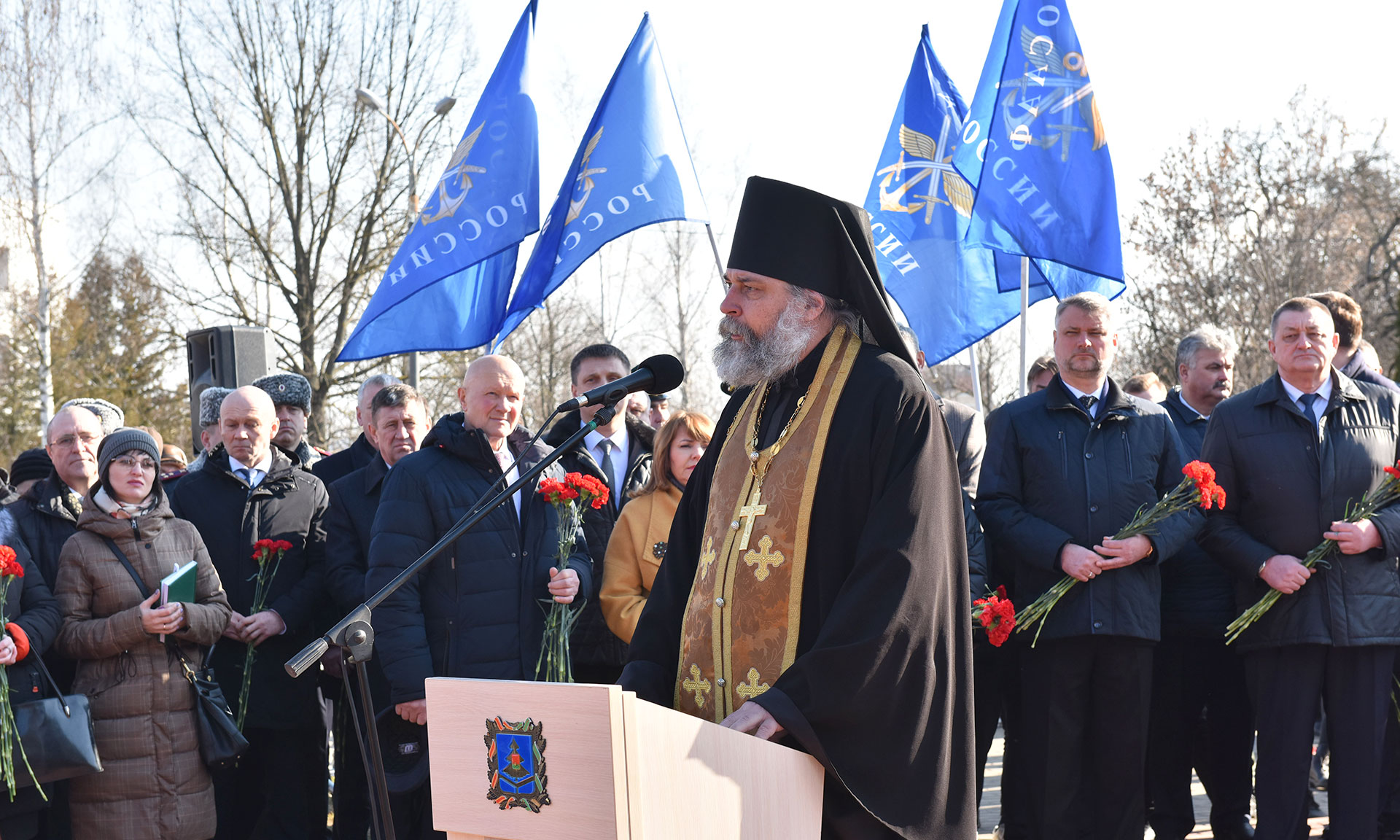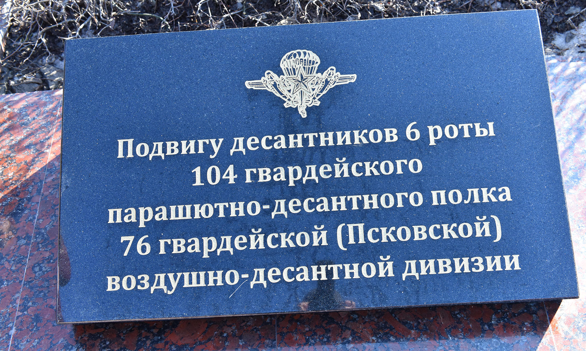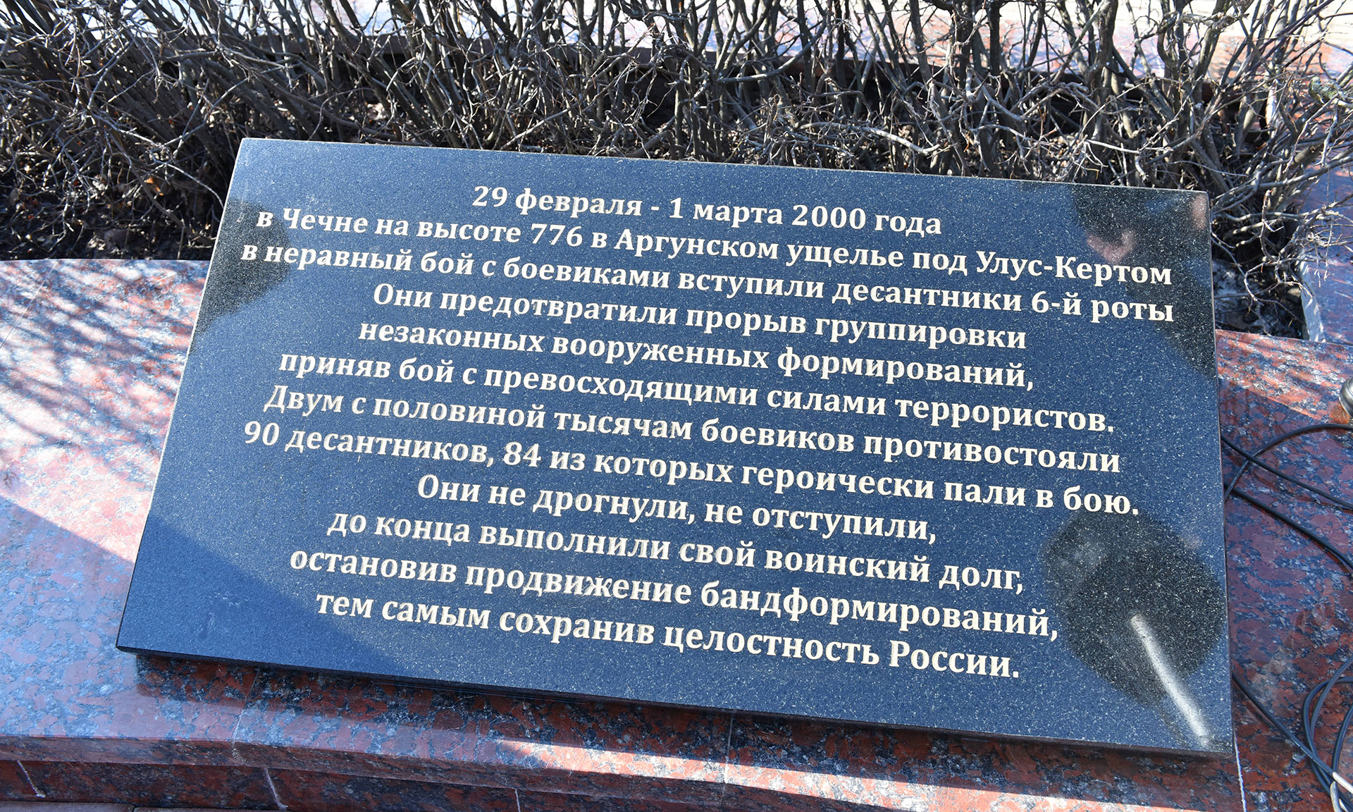 — Дорогие друзья! Сегодня мы отдаем дань памяти героизму и мужеству воинов-десантников, навсегда «ушедших в небо». В 90-е и 2000-е годы наша страна столкнулась со страшной чумой — международным терроризмом. Совсем недавно на этом месте мы вспоминали всех, кто, защищая целостность нашей страны, нес службу в Афганистане, Чечне, на Северном Кавказе. А сегодня мы вновь собрались здесь, чтобы почтить память и увековечить имена пяти наших земляков, бойцов 6-й роты 2-го батальона 104-го гвардейского парашютно-десантного полка 76-й гвардейской воздушно-десантной (Псковской) дивизии.