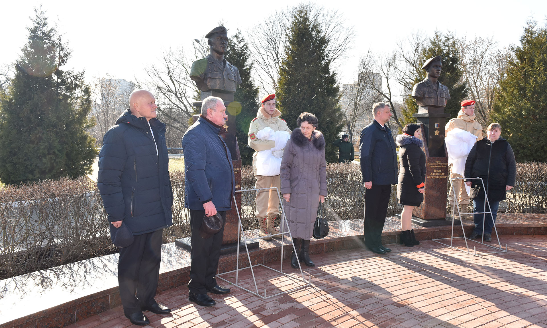 На открытии бюстов присутствовали родители, родственники, друзья погибших героев: мама Олега Ермакова Лидия Филипповна, родители Сергея Василева — Галина Георгиевна и Владимир Фролович, мама Алексея Рассказы Галина Николаевна, мама Александра Трубенка Лидия Тимофеевна, сестры Александра Гердта Мария Александровна и Галина Александровна. Вместе с руководителями региона они открыли бюсты Герою Российской Федерации Олегу Ермакову, Герою Российской Федерации Сергею Василеву, Герою Российской Федерации Александру Гердту, Герою Российской Федерации Алексею Рассказе, награжденному Орденом Мужества Александру Трубенку.
