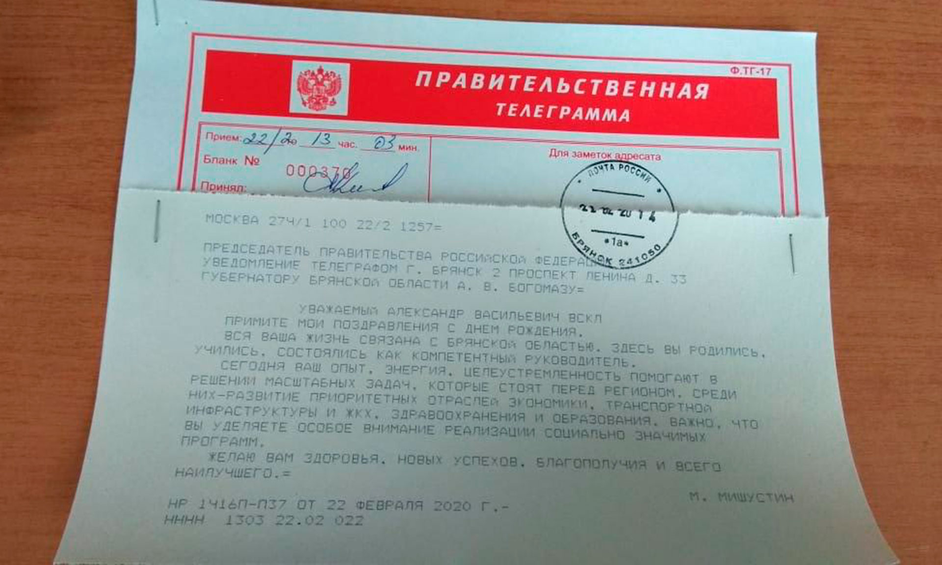 Председатель Правительства Российской Федерации Михаил Мишустин поздравил Александра Богомаза с днем рождения.