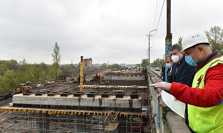 Руководитель подрядной организации рассказал, что каждый сотрудник обеспечен средствами защиты и антисептиками. До начала рабочего дня, а также несколько раз во время работы, проводится измерение температуры тела. Ведется жесткий контроль за обязательным использованием масок. Также подрядчик доложил о ходе строительства. В данный момент общая готовность моста составляет более 45%: полностью готовы 8 ростверков из 12; 7 стоек опор из 12; 6 ригелей из 12. Сегодня будут уложены 2 балки на мостовом пролете между 6-й и 7-й опорами. Завтра на объекте ожидают следующую партию балок. Всего на мосту будет уложено 99 балок: по 9 на каждый из 11 пролетов. Вес каждой балки не менее 37 тонн. Строители рассказали, что новый мост будет выдерживать нагрузку в 100 тонн, в отличие от старого, который был рассчитан на 80 тонн.