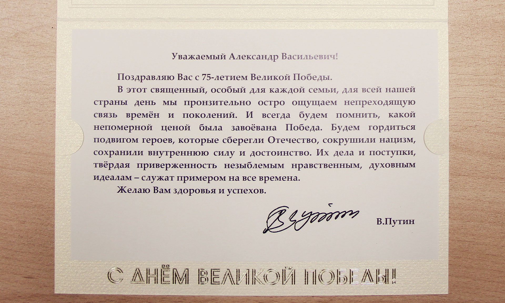 В этот священный, особый для каждой семьи, для всей нашей страны день мы пронзительно остро ощущаем непреходящую связь времен и поколений. И всегда будем помнить, какой непомерной ценой была завоевана Победа. Будем гордиться подвигом героев, которые сберегли Отечество, сокрушили нацизм, сохранили внутреннюю силу и достоинство. Их дела и поступки, твердая приверженность незыблемым нравственным, духовным идеалам — служат примером на все времена.