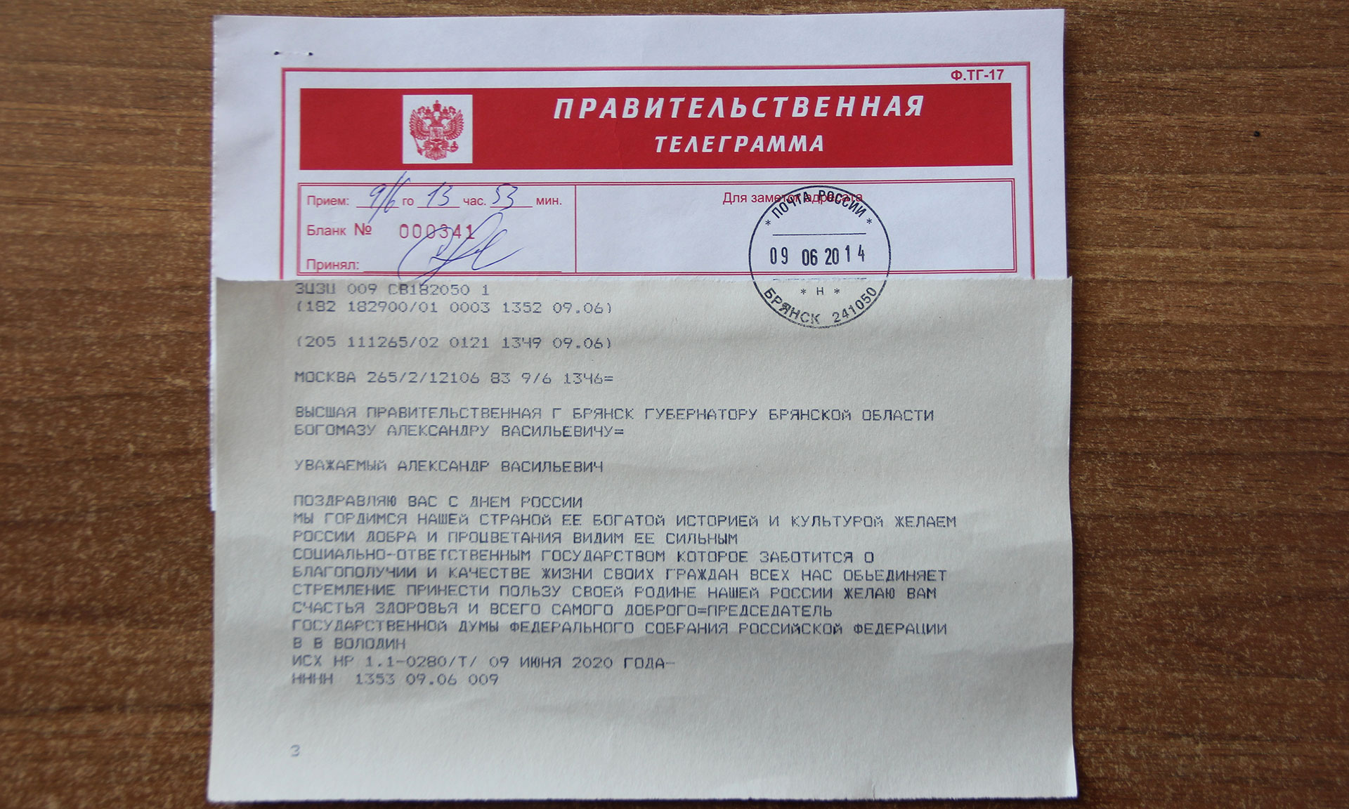 Председатель Государственной Думы Федерального Собрания Российской Федерации Вячеслав Володин поздравил Губернатора Брянской области Александра Богомаза с Днем России.