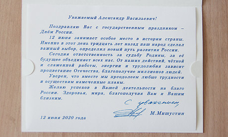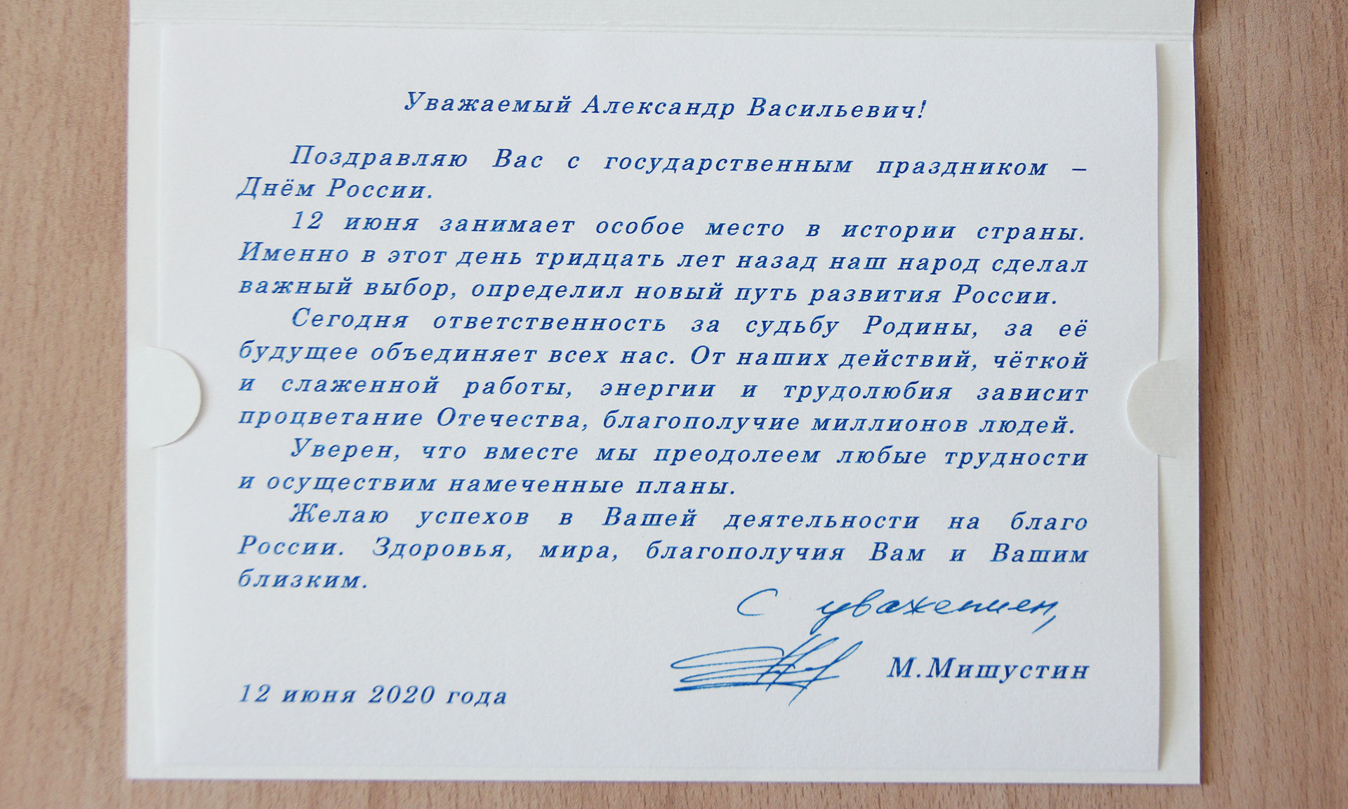 Желаю успехов в Вашей деятельности на благо России. Здоровья, мира, благополучия Вам и Вашим близким.»
