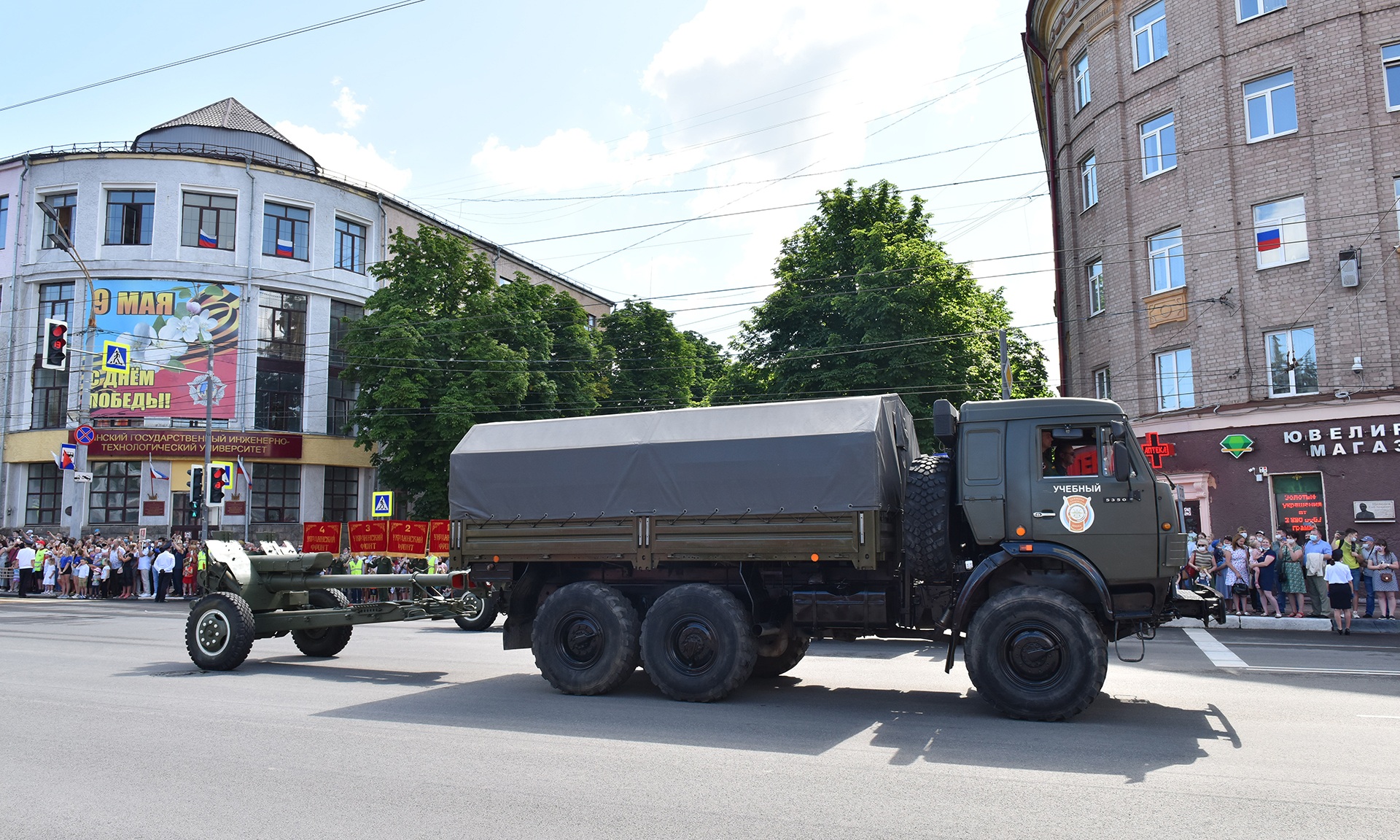 Участники торжественного марша увидели парадный расчет гаубиц калибром 122-мм Д-30, КамАЗ-43269 «Выстрел», колонну специальной автомобильной техники Брянского автомобильного завода.