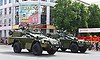 В марше приняли участие боевые колесные плавающие машины БТР-80, предназначенные для транспортировки подразделений мотострелков, морских пехотинцев и их огневой поддержки на поле боя. Бронетранспортер вооружен пулеметом КПВТ калибра 14,5 мм и спаренным с ним пулеметом ПКТМ калибра 7,62 мм, установленными в башне.