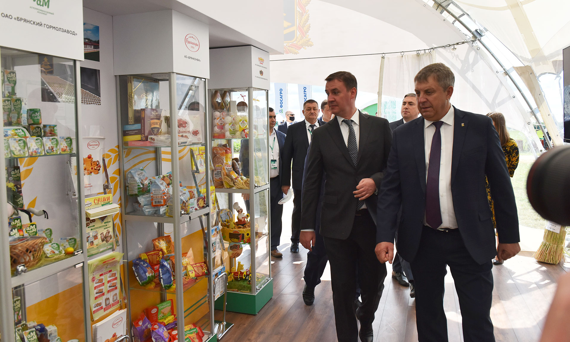 Министр сельского хозяйства РФ Дмитрий Патрушев и Губернатор Брянской области Александр Богомаз посетили павильон региона, представленный в рамках выставки «Всероссийский день поля».