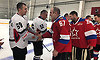 Для символического вбрасывания шайбы на лед были приглашены капитаны команд Сергей Неверов и Александр Богомаз.