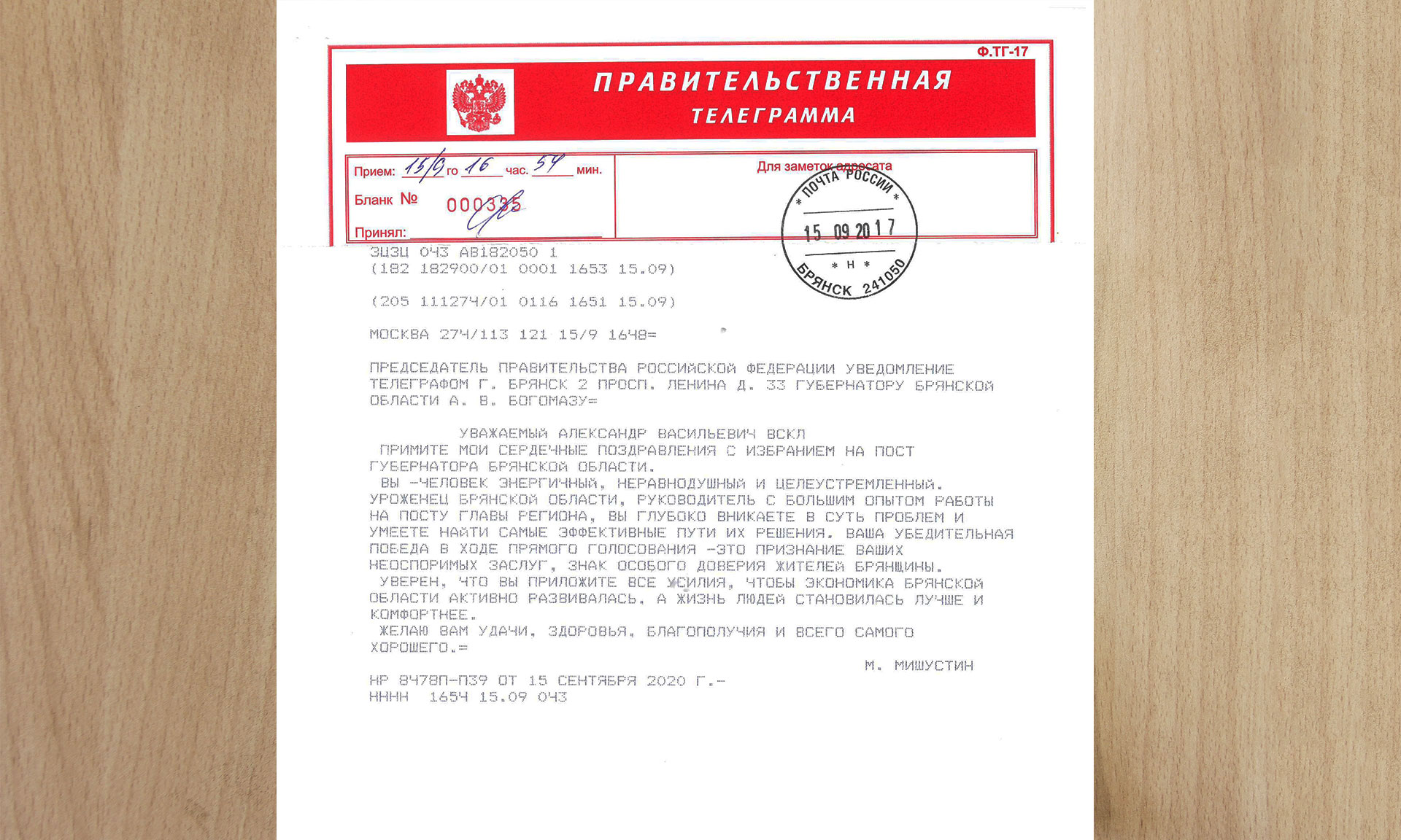 Премьер-министр Российской Федерации Михаил Мишустин поздравил главу региона Александра Богомаза с убедительной победой на выборах: