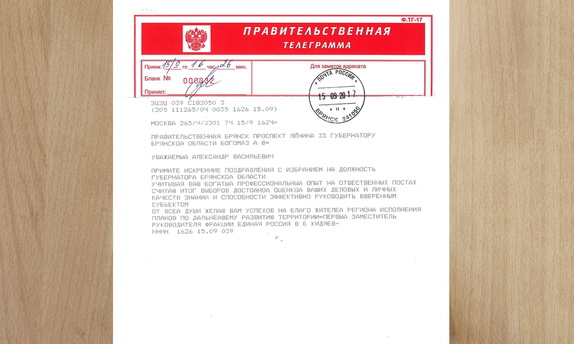 В адрес Губернатора Брянской области Александра Богомаза поступила поздравительная телеграмма от первого заместителя руководителя фракции «Единая Россия» в Государственной Думе Федерального Собрания Российской Федерации, президента Общероссийского Конгресса муниципальных образований, председателя Высшего совета «Национальной ассоциации развития местного самоуправления» Виктора Кидяева.