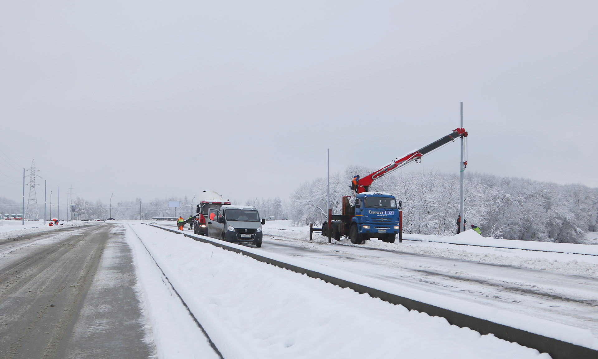 На самой дороге на 90% установлен поребрик, такой же объем бортового камня смонтирован на тротуарах, работа продолжается на разделительной полосе. На участке от проспекта Московского до нового моста сейчас устанавливаются опоры электроосвещения. Всего на этом участке их будет около 100, подрядчик уже смонтировал более половины от этого объема. Металлические столбы заглубляются в грунт на два метра и бетонируются. После застывания бетона электрики начнут крепить на них светильники.