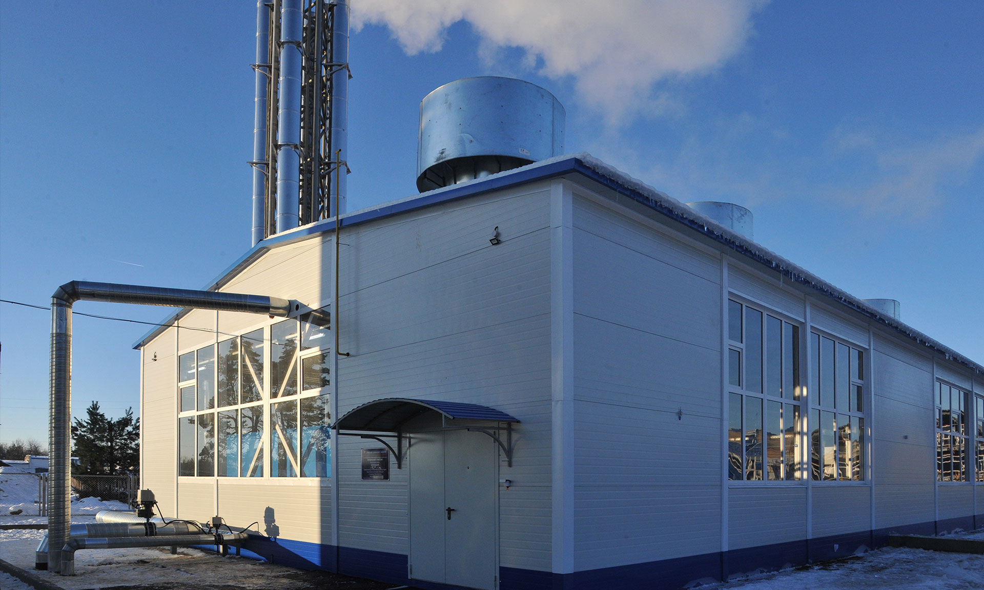 Также установлена блочно-модульная котельная. Выполнены работы по устройству теплотрассы. Проложена внутриплощадочная канализация, водопровод и газопровод к котельной.