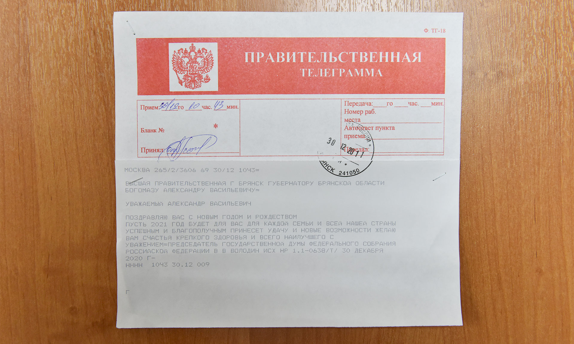 Председатель Государственной Думы ФС РФ Вячеслав Володин поздравил Губернатора Брянской области Александра Богомаза с Новым годом и Рождеством.