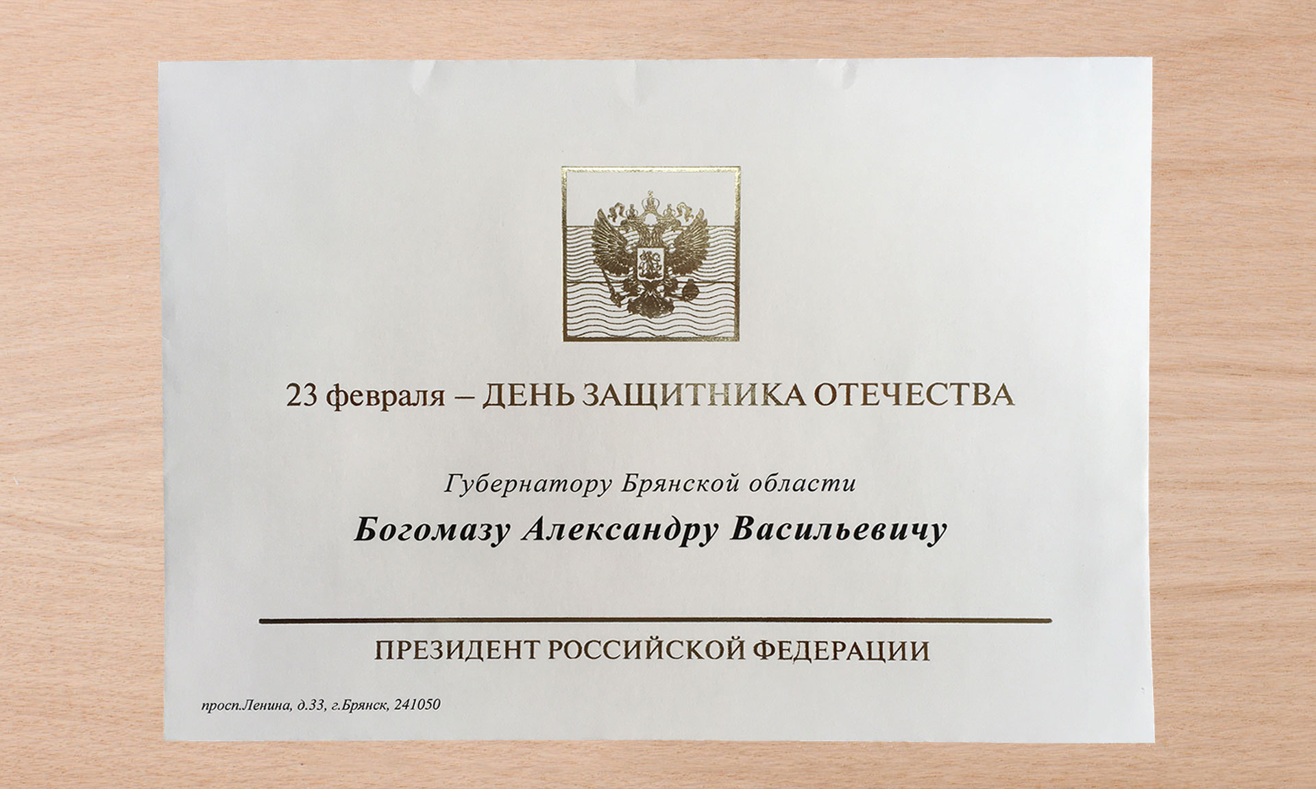 Президент России Владимир Путин поздравил Губернатора Брянской области Александра Богомаза с Днем защитника Отечества.