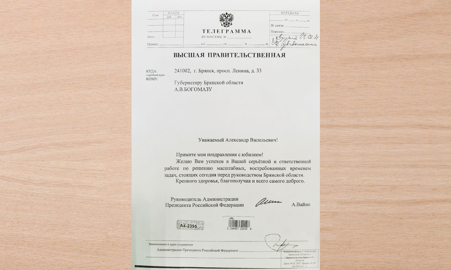 В адрес Губернатора Брянской области Александра Богомаза поступило поздравление с юбилеем от руководителя Администрации Президента Российской Федерации Антона Вайно.