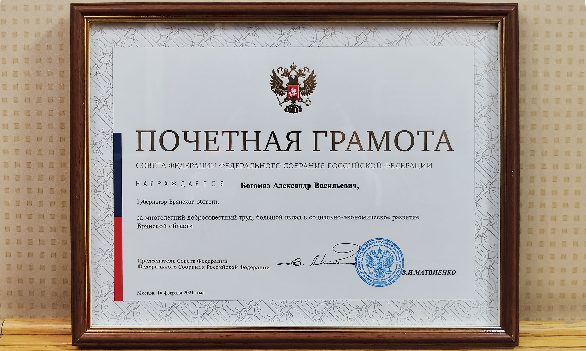 25 февраля сенатор Галина Солодун по поручению председателя Совета Федерации Валентины Матвиенко вручила Губернатору Александру Богомазу Почетную грамоту Совета Федерации. Награждение состоялось в ходе двадцать шестого заседания Брянской областной Думы.