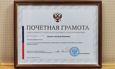 Благодаря своему труду Вы завоевали авторитет на федеральном уровне. Привлекли и привлекаете в регион финансовые вложения. Александр Васильевич, разрешите от имени Совета Федерации, за многолетний добросовестный труд, большой вклад в социально-экономическое развитие Брянской области вручить Вам Почетную грамоту Совета Федерации Федерального Собрания Российской Федерации.