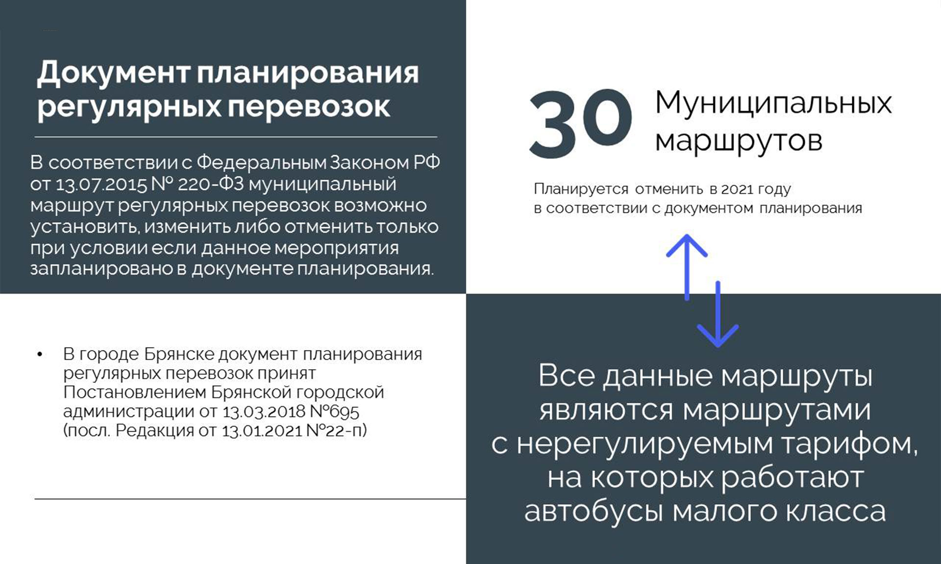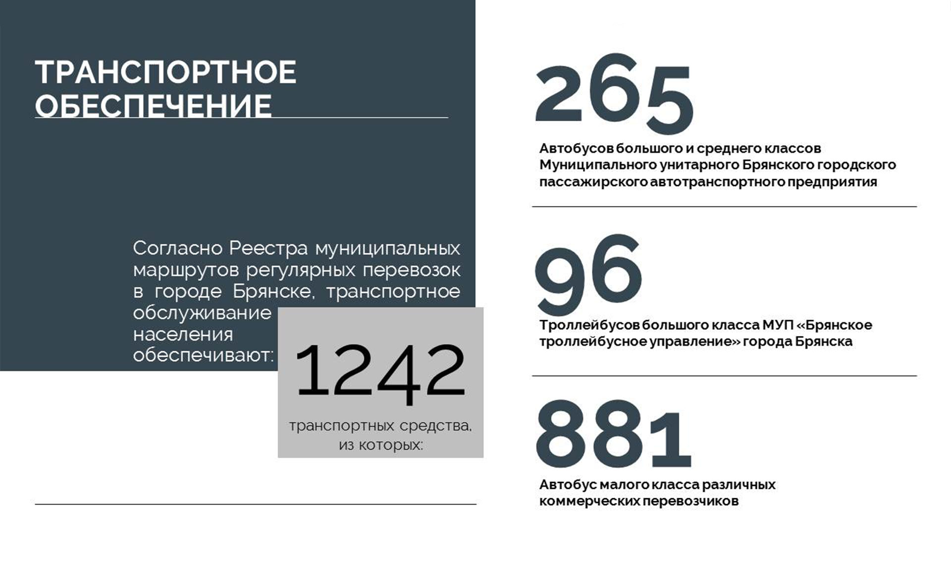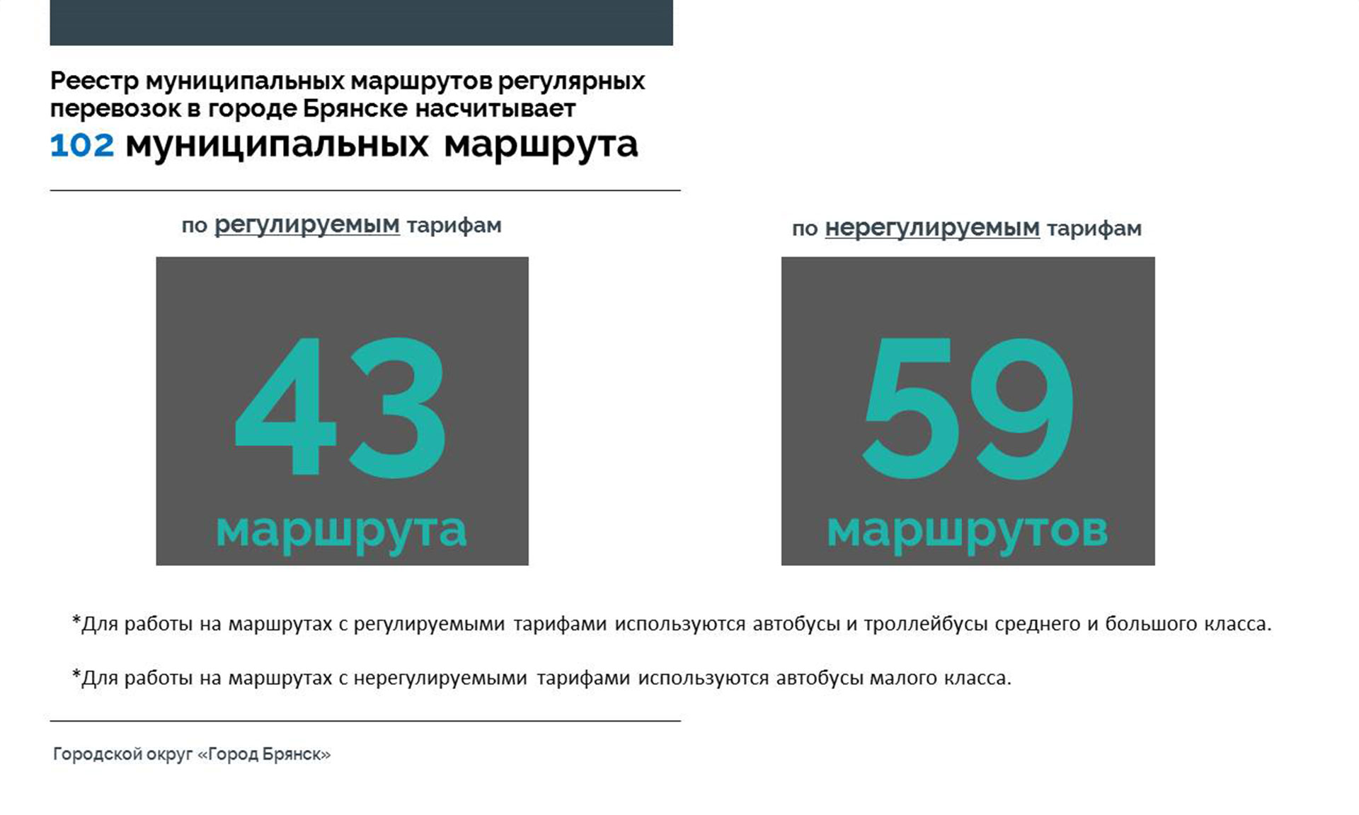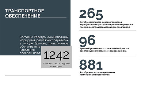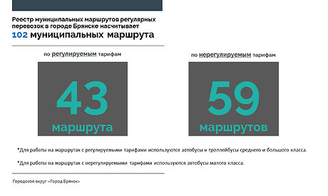 Как сообщил заместитель главы Брянской городской администрации Николай Голубокий, на сегодняшний день реестр муниципальных маршрутов регулярных перевозок в городе Брянске насчитывает 102 муниципальных маршрута. 43 маршрута по регулируемым тарифам обслуживают 265 автобусов среднего и большого классов муниципального унитарного Брянского городского пассажирского автотранспортного предприятия (МУ БГПАТП) и 96 троллейбусов Брянского троллейбусного управления (МУП «БТУ» г. Брянска). 59 маршрутов работают по нерегулируемым тарифам, по ним курсируют маршрутные такси — 881 машина, их обслуживают три юридических лица и 28 индивидуальных предпринимателей.