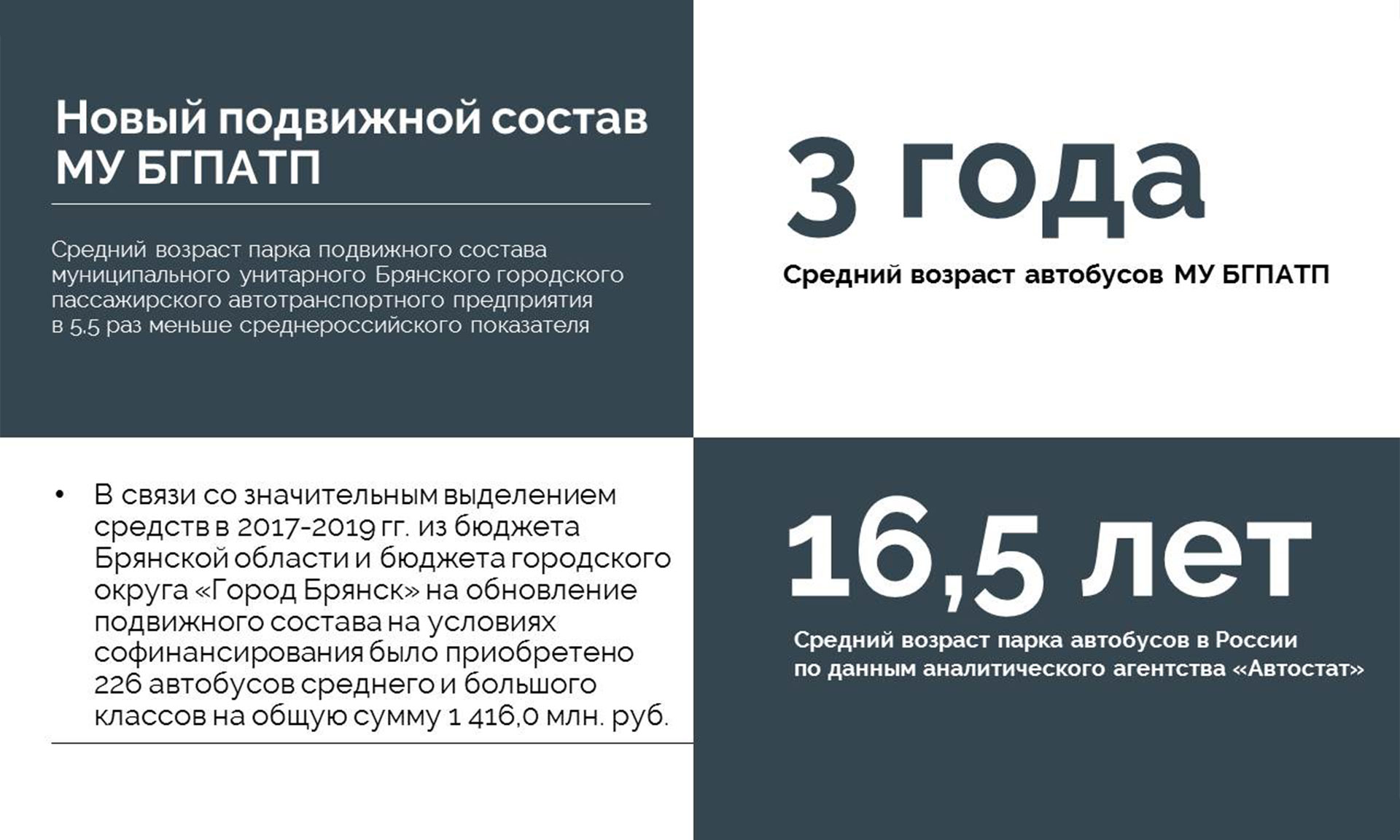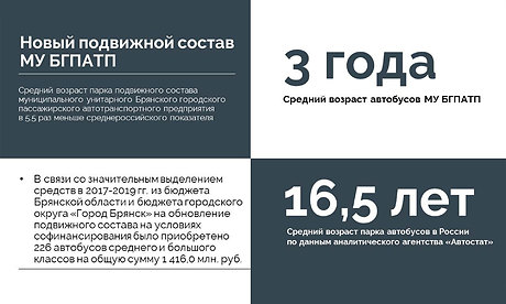 Средний возраст парка подвижного состава БГПАТП в 5,5 раза меньше среднероссийского показателя — три года против 16,5 лет. По решению, принятому Губернатором Брянской области о необходимости приобретения новых автобусов большой вместимости, за 2017–2019 годы за счет средств областного бюджета приобретено 226 автобусов на сумму 1 млрд 416 млн рублей.