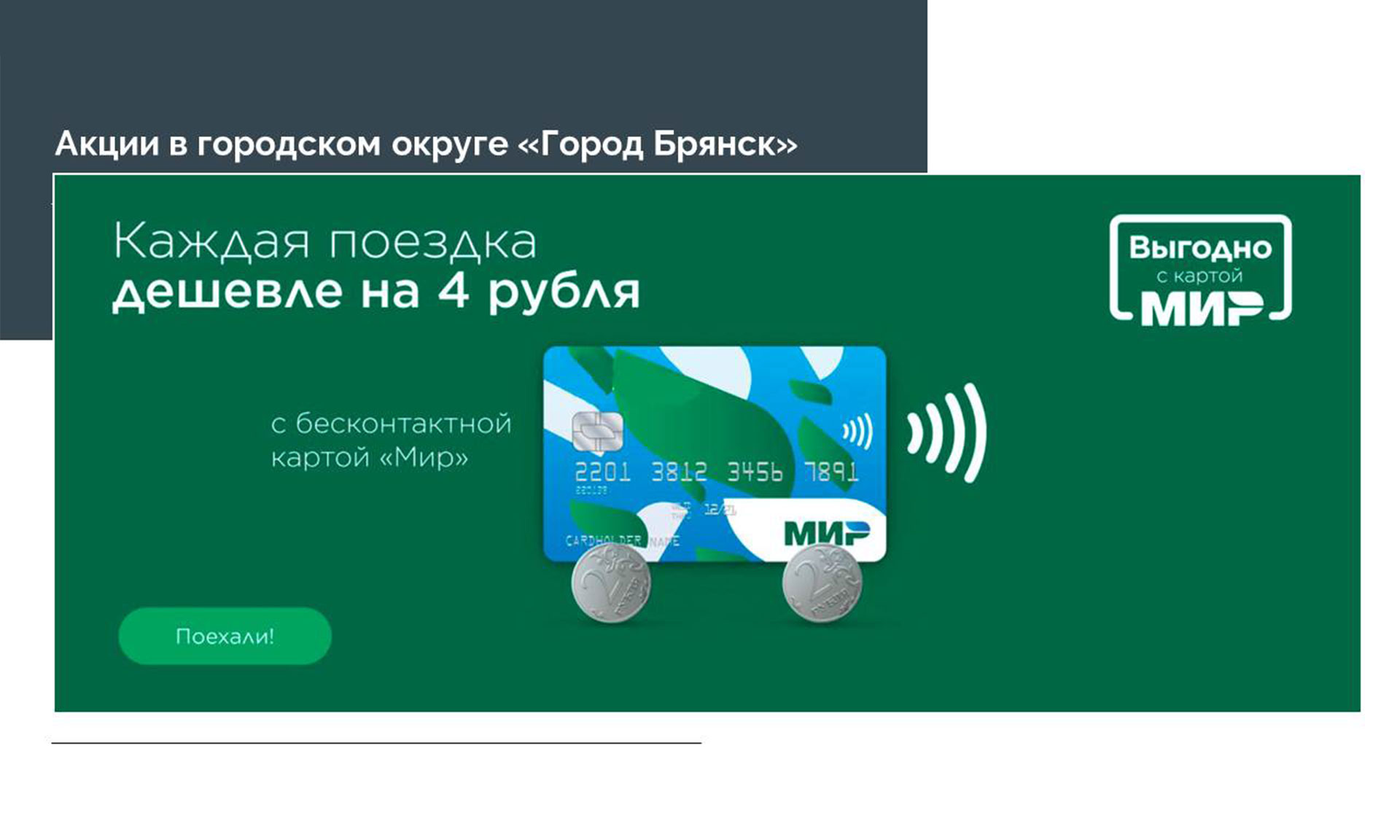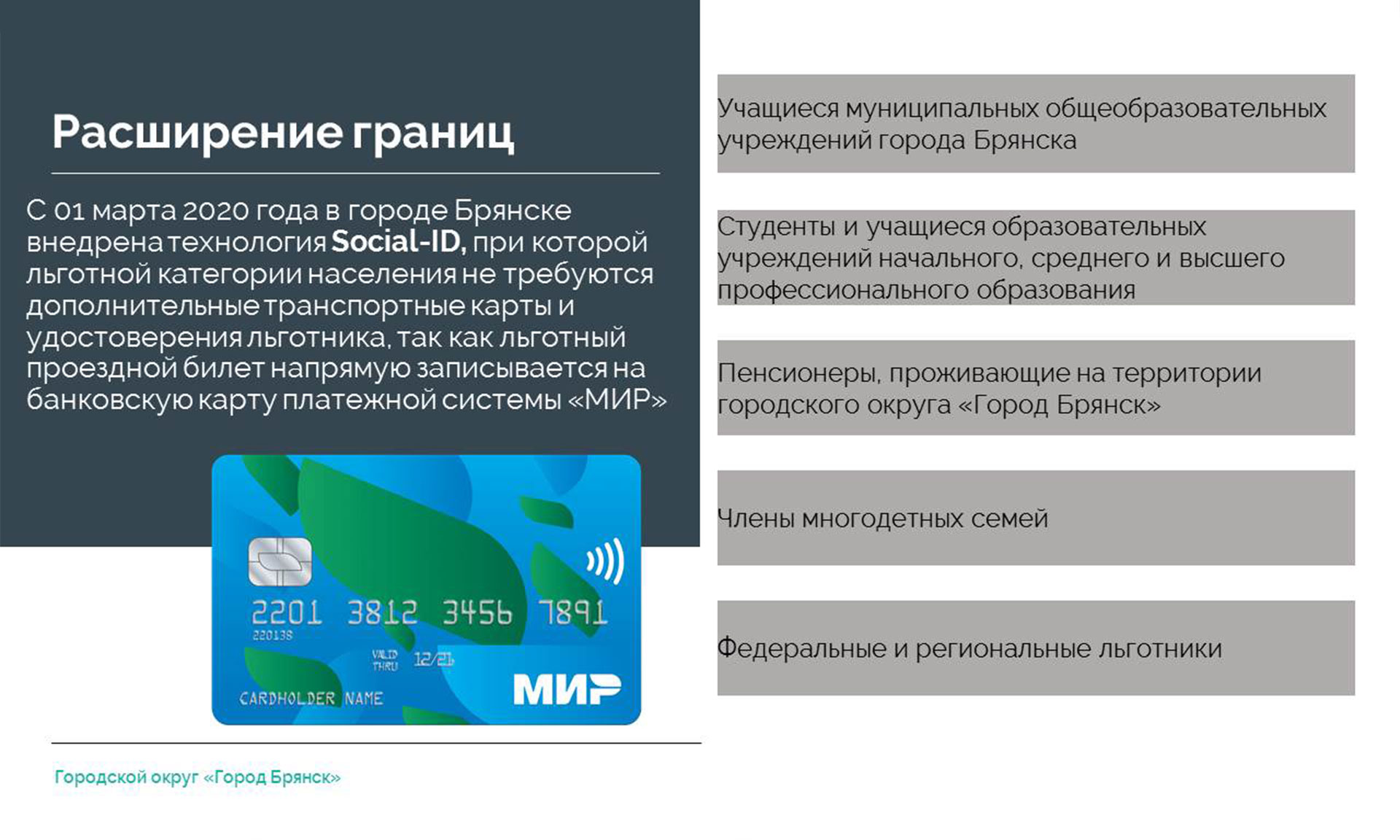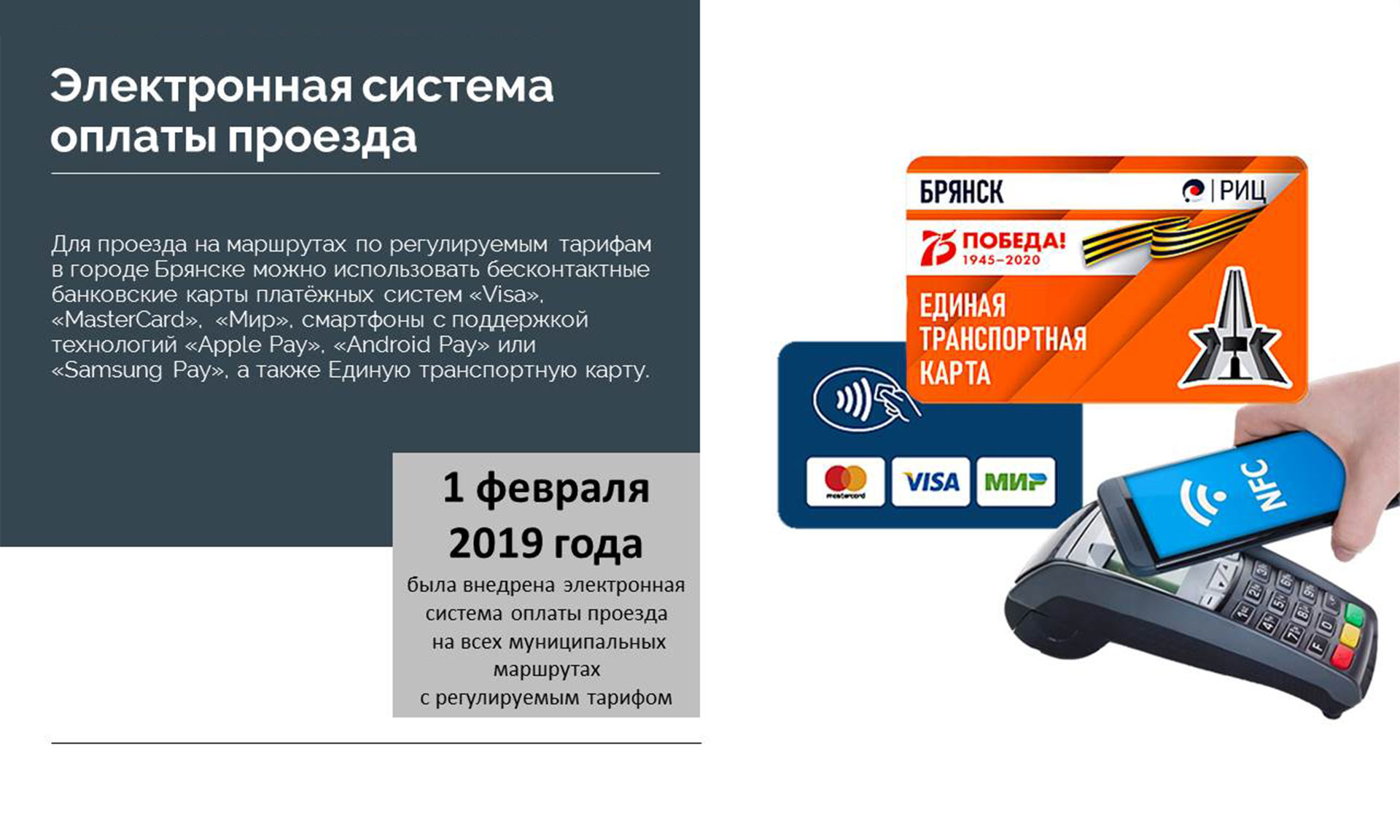 1 февраля 2019 года была внедрена электронная система оплаты проезда на всех муниципальных маршрутах с регулируемым тарифом, а с 1 марта 2020 года — технология Social-ID, при которой льготной категории населения не требуются дополнительные транспортные карты и удостоверения льготника, проездной билет напрямую записывается на банковскую карту платежной системы «МИР». При использовании карты «МИР» каждая поездка в общественном муниципальном транспорте Брянска обходится еще и на 4 рубля дешевле.