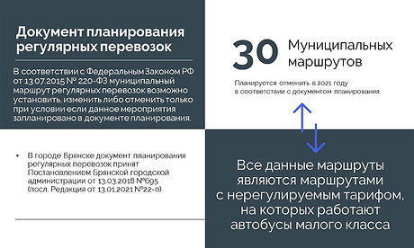 Как пояснил Николай Голубокий, предусмотрены мероприятия по оптимизации общественного транспорта на территории города Брянска, в том числе и мероприятия по отмене большей части муниципальных маршрутов регулярных перевозок в городе Брянске по нерегулируемым тарифам. Ряд маршруток дублируют уже существующие автобусные маршруты, некоторые перевозчики получают лицензии на маршрут, но не имеют ни одной единицы автотранспорта. Есть и такой пример: по маршруту № 36 работают три перевозчика — при этом у 36–1 в наличии 32 машины, а у 36–2 и 36–3 — всего по две. В результате преимущественное право работать на маршруте будет у того перевозчика, который действительно работает, а не выпускает на линию машину раз в день.