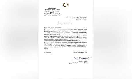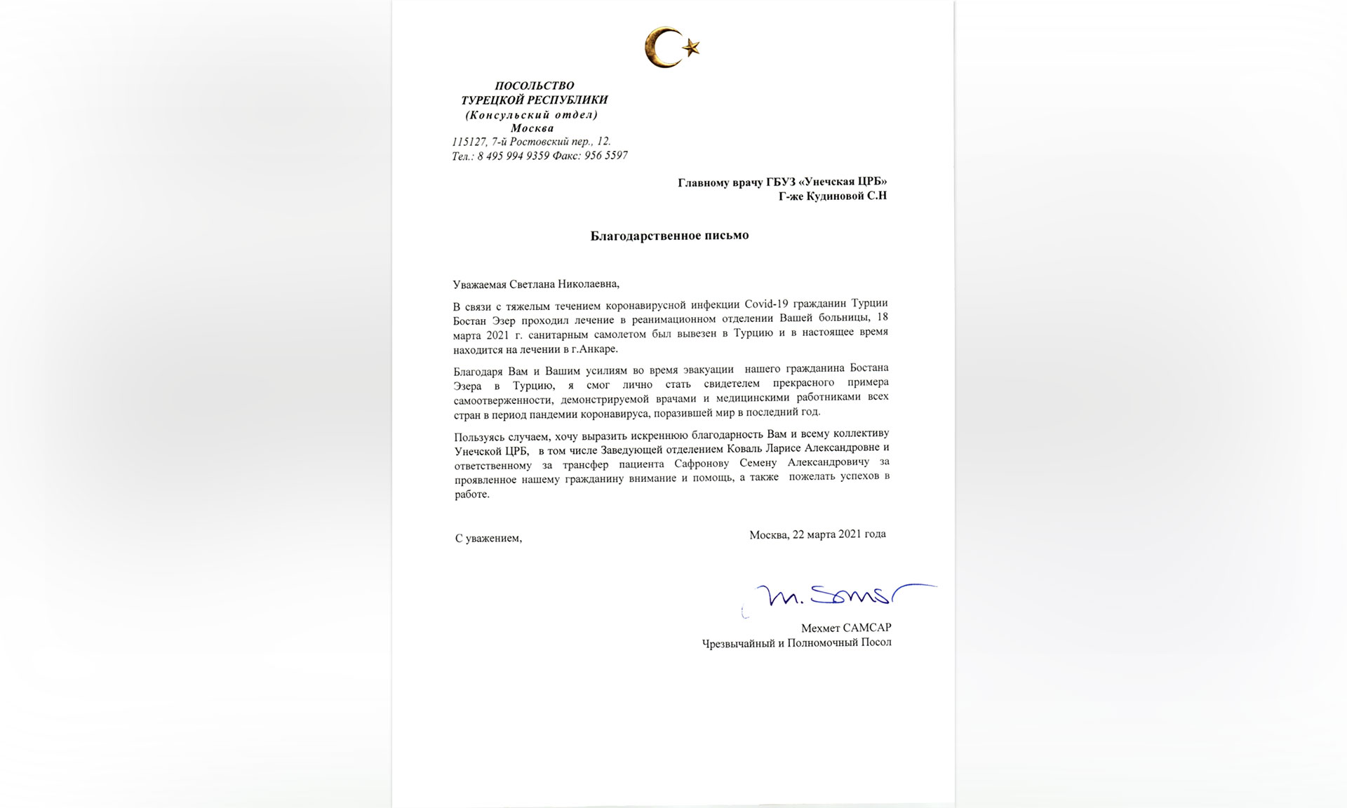 Чрезвычайный и Полномочный Посол Турецкой Республики в Российской Федерации Мехмет Самсар направил в адрес главного врача Унечской ЦРБ Светланы Кудиновой, заведующей отделением Ларисы Коваль, ответственного за транспортировку пациента Семена Сафронова и всего коллектива госпиталя Благодарственное письмо. В нем, в частности, выражается искренняя благодарность за проявленное к гражданину Турции внимание и помощь. Посол пожелал врачам успехов в работе.